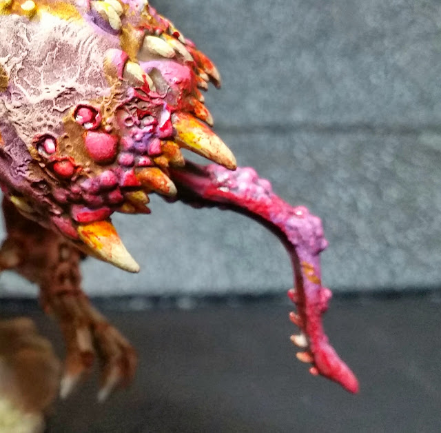 I loved the details and the textures of this model. GW gave me a million little boils to paint, crazy veins, teeth, horns, metal and torn muscle tissue. I added some great textures as well with the cables (courtesy of the GSI Tentacle Maker) AND one very large wound ...