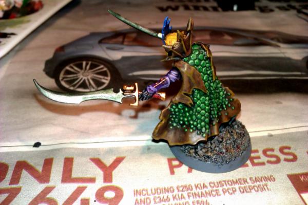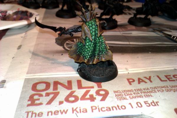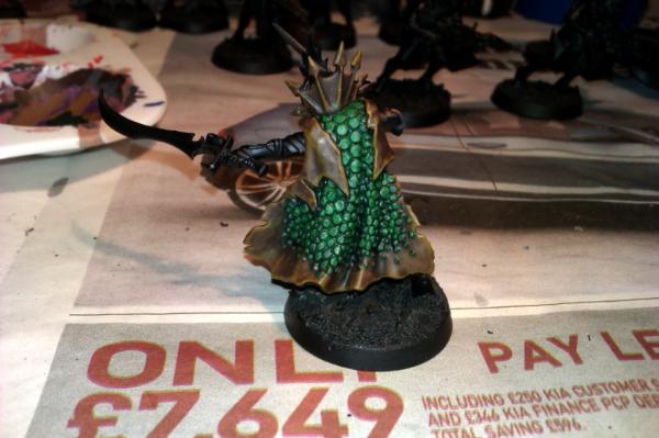 Next I painted the scaled part of the cloak with Dark Angel Green: