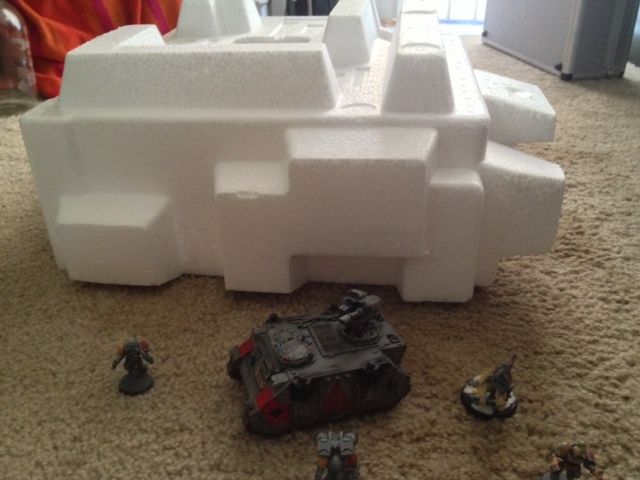 I don't know if this would be the right forum for this question, but as it involves painting and terrain building, it was as good as any I figure. I've got a Styrofoam piece from a new PC. It would make an AWESOME fortress, I think and easily be modified with weapons to use the rules for Imperial Bastion/Strongpoint. The thing is, it's 20'x20" from longest part to widest. It's got a big opening that could be a bay door for armor, multiple levels. It could be a really cool project but I wonder if it's just too big to actually use in game. What do you guys think?