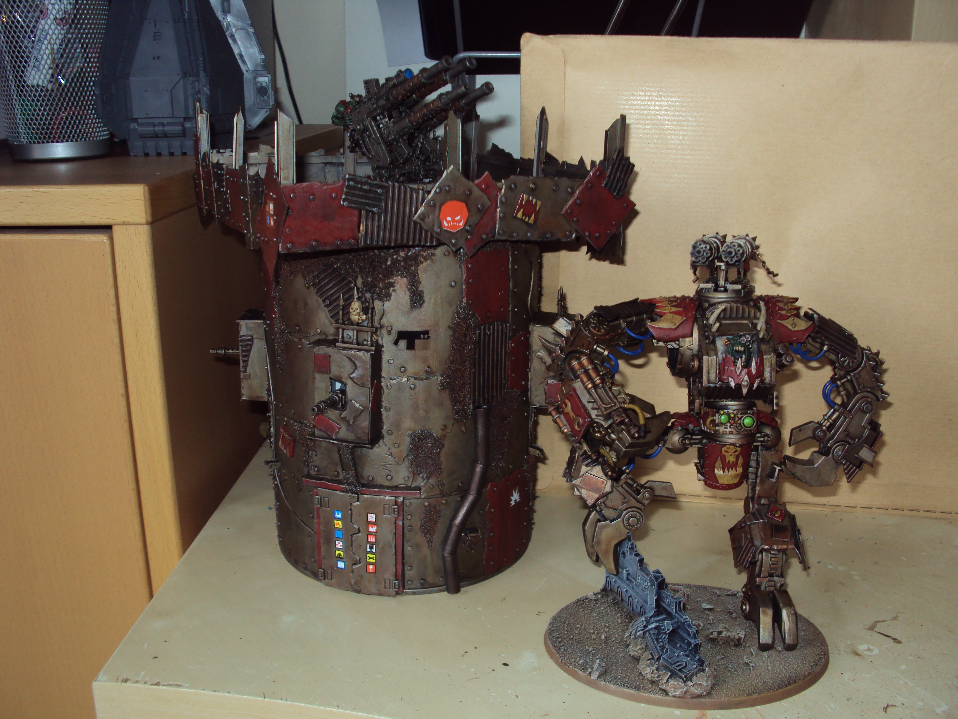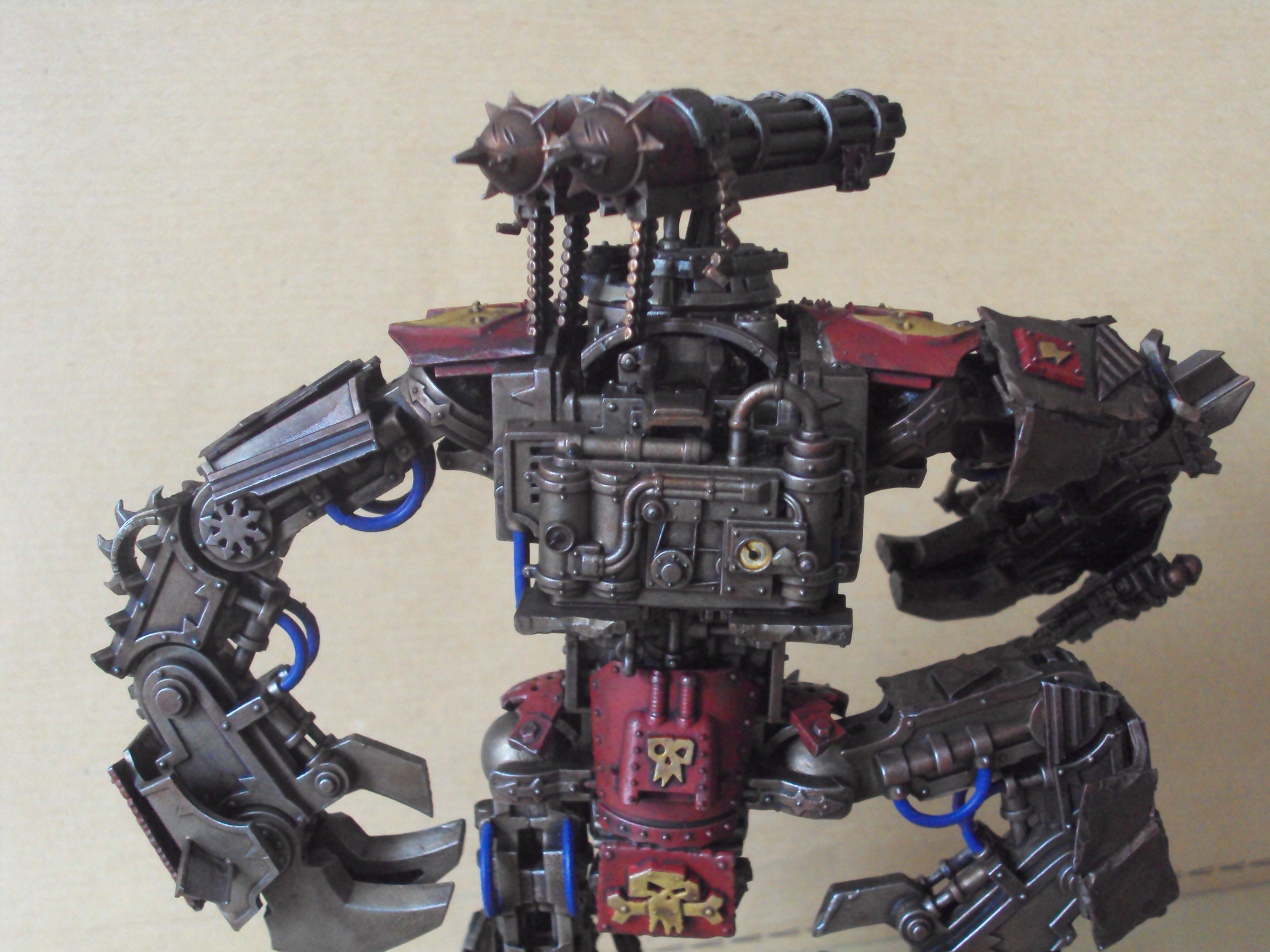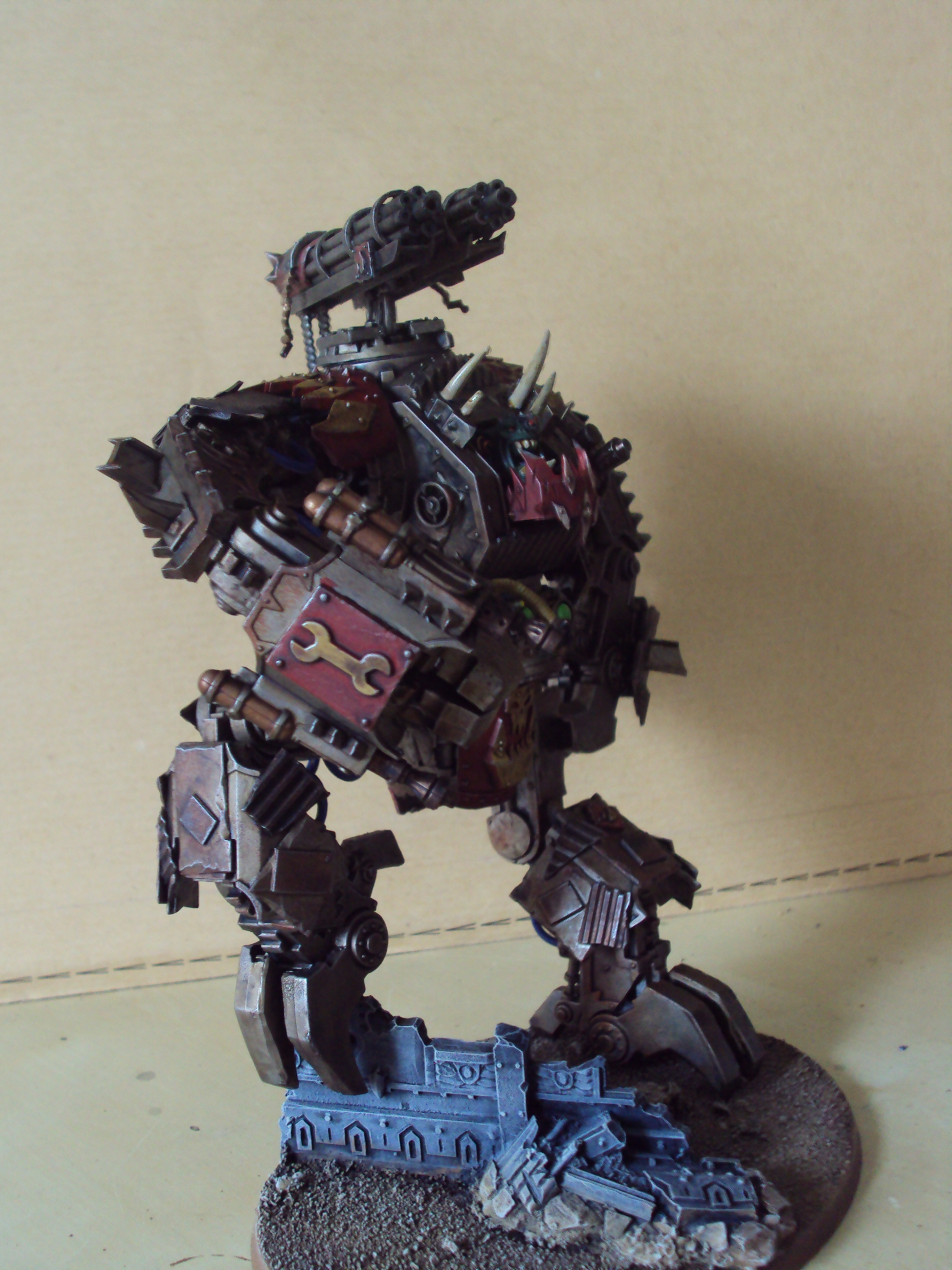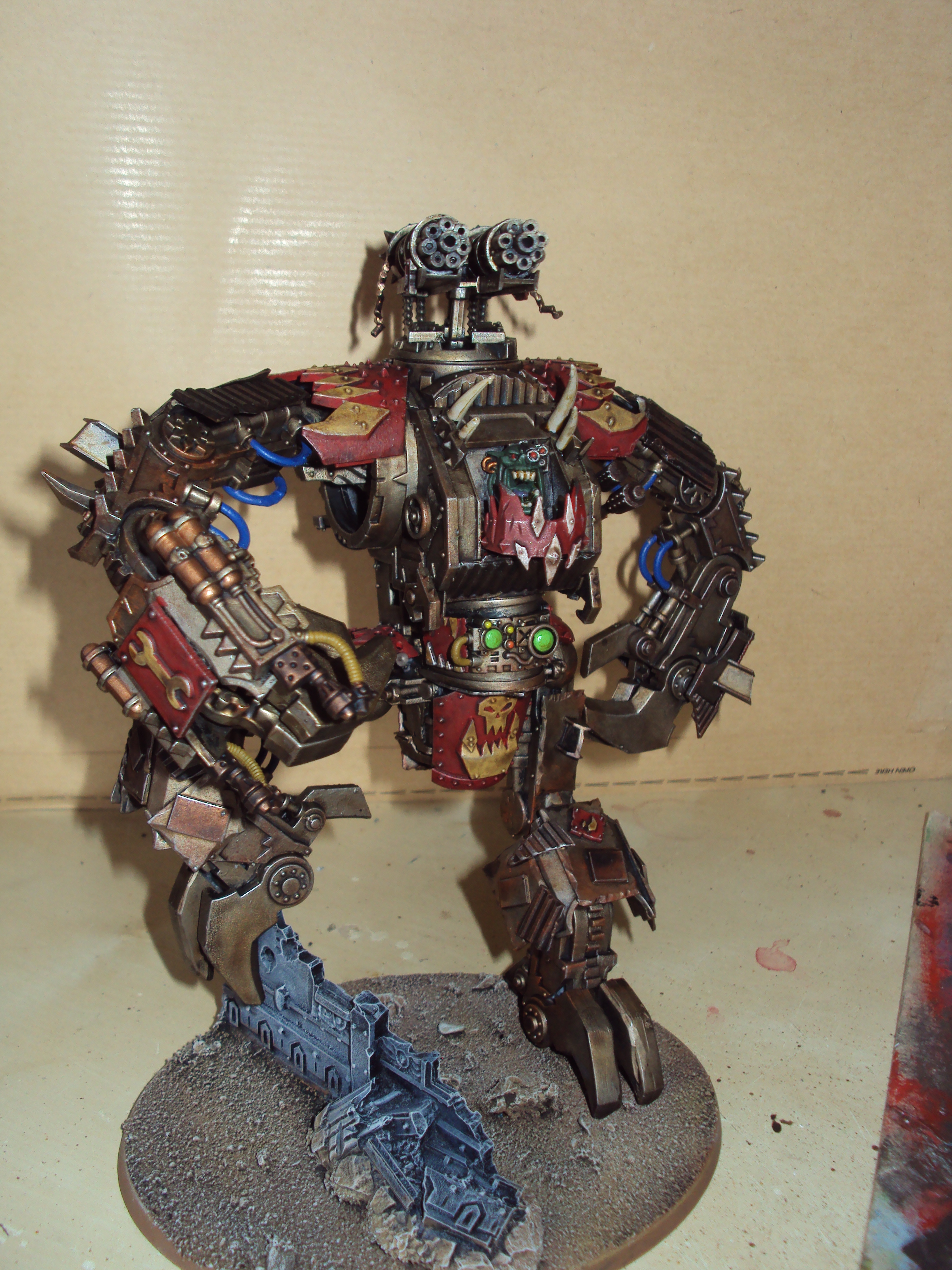 orks get bigger the more battles they fight makes sense that one would get MC sized or get put in a giant machine.