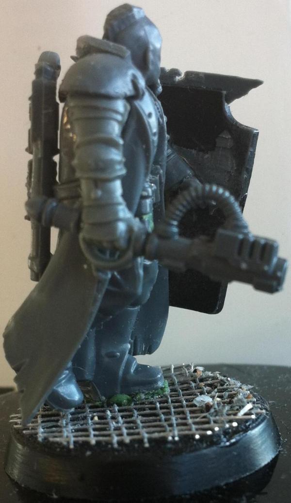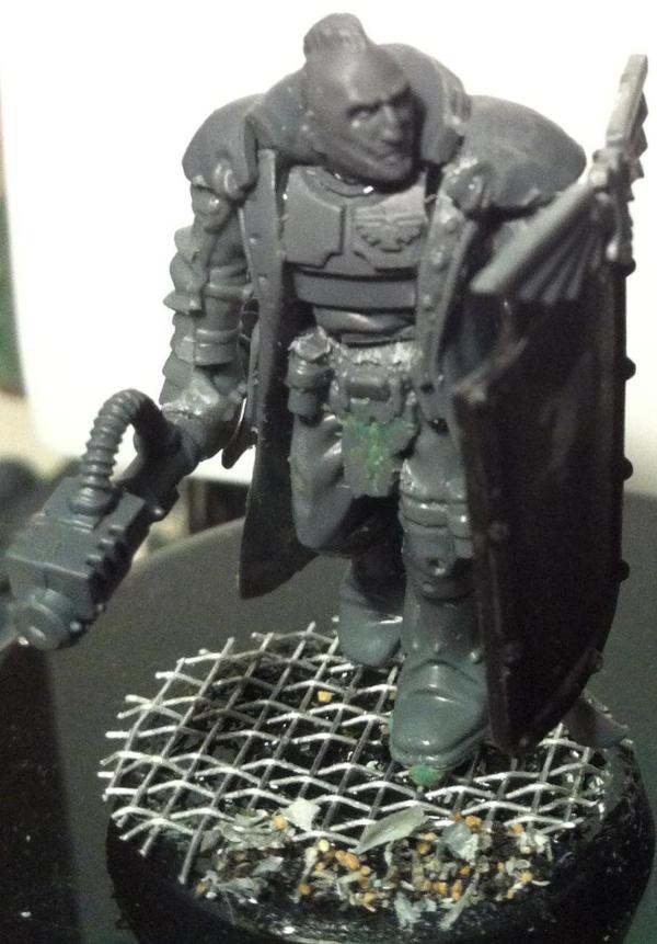 Thank you. The body and the shotgun is from one of the cultist leaders in the dark vengeance set with a bit of flak armor slotted in. his head is from the one of the ig command squads. The shock maul is from a grey knight force hammer. The arm holding the shock maul is from the empire militia kit. The shield is from the men at arms kit. The shoulder pads are from the kroot kit.