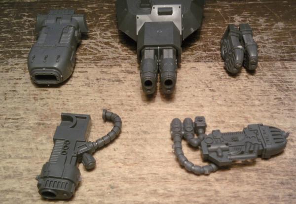 2) Storm Raven plasma cannon (pair): get rid of the canisters in the back and they will fit right in with minimal shaving. I believe this is the best-looking plasma bit for the job, and trust me, I have tried them all. It's probably also the cheapest if you're buying bitz.