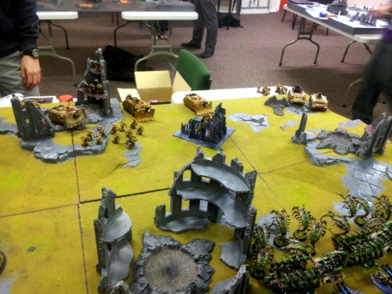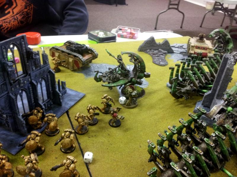 Dev squad nearby and the squad is dead! Necrons inside a Ghost Ark broadside it and the Vindie is dead. Remaining Warriors and Ghost Arks strip hull points from a Razorback with gauss while the remaining