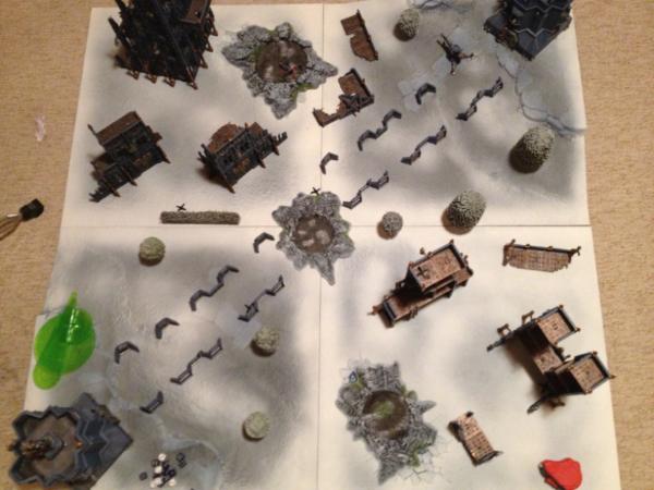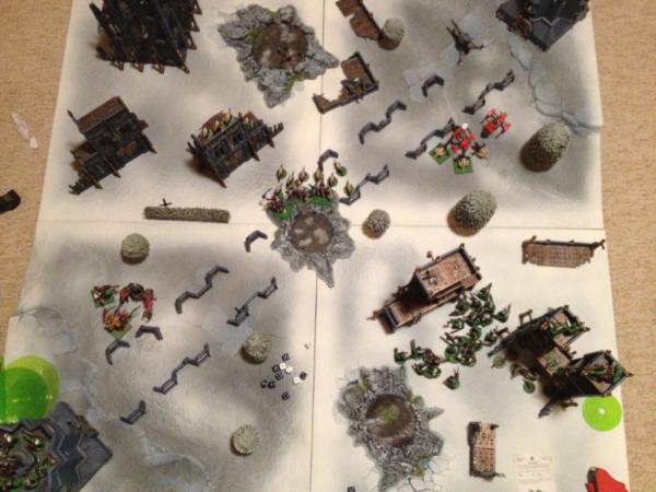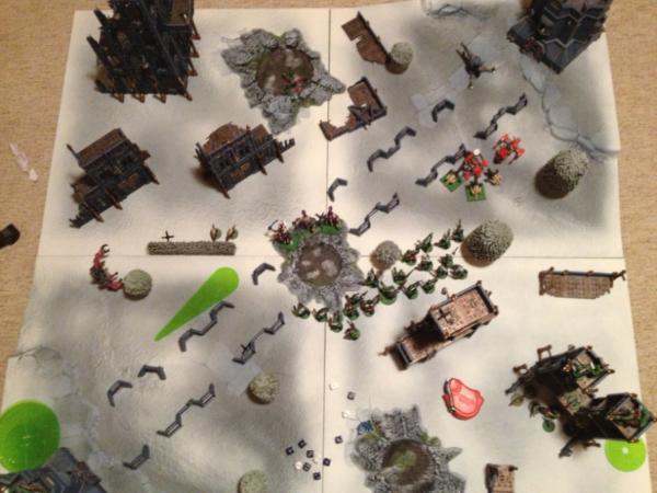 4x4 map, objectives can be seen as small plastic Xs. The Nids rolled higher and got 3 objs, the Orks 2.
