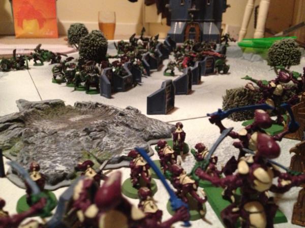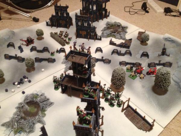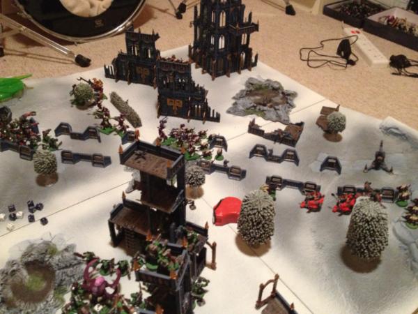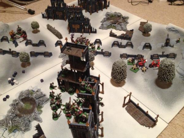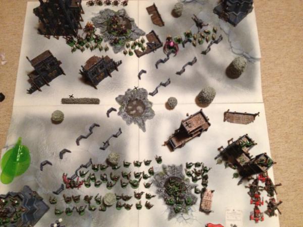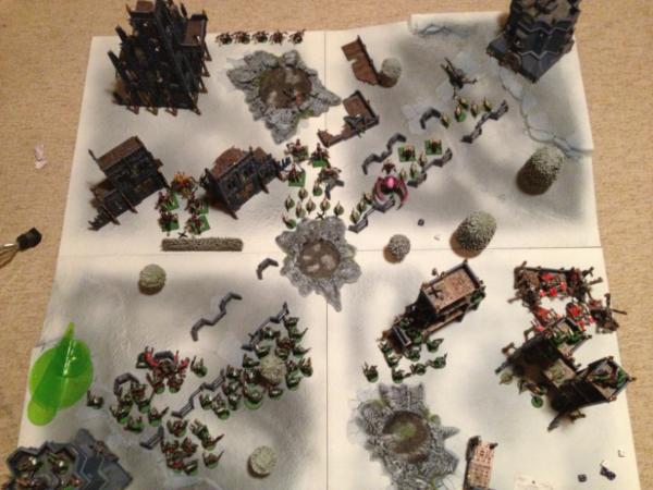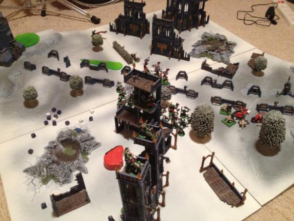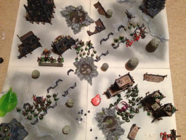 The basic plan was to hold their two home objectives (the reliable Grots tasked with holding one) and then to swarm foward and take one or two of the others.