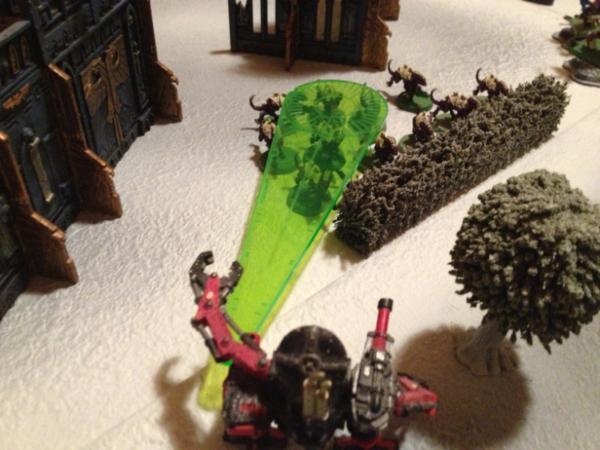 The Deffdread moved to setup for a flamer attack and or charge on the Termagants behind the hedgerow holding that obj.