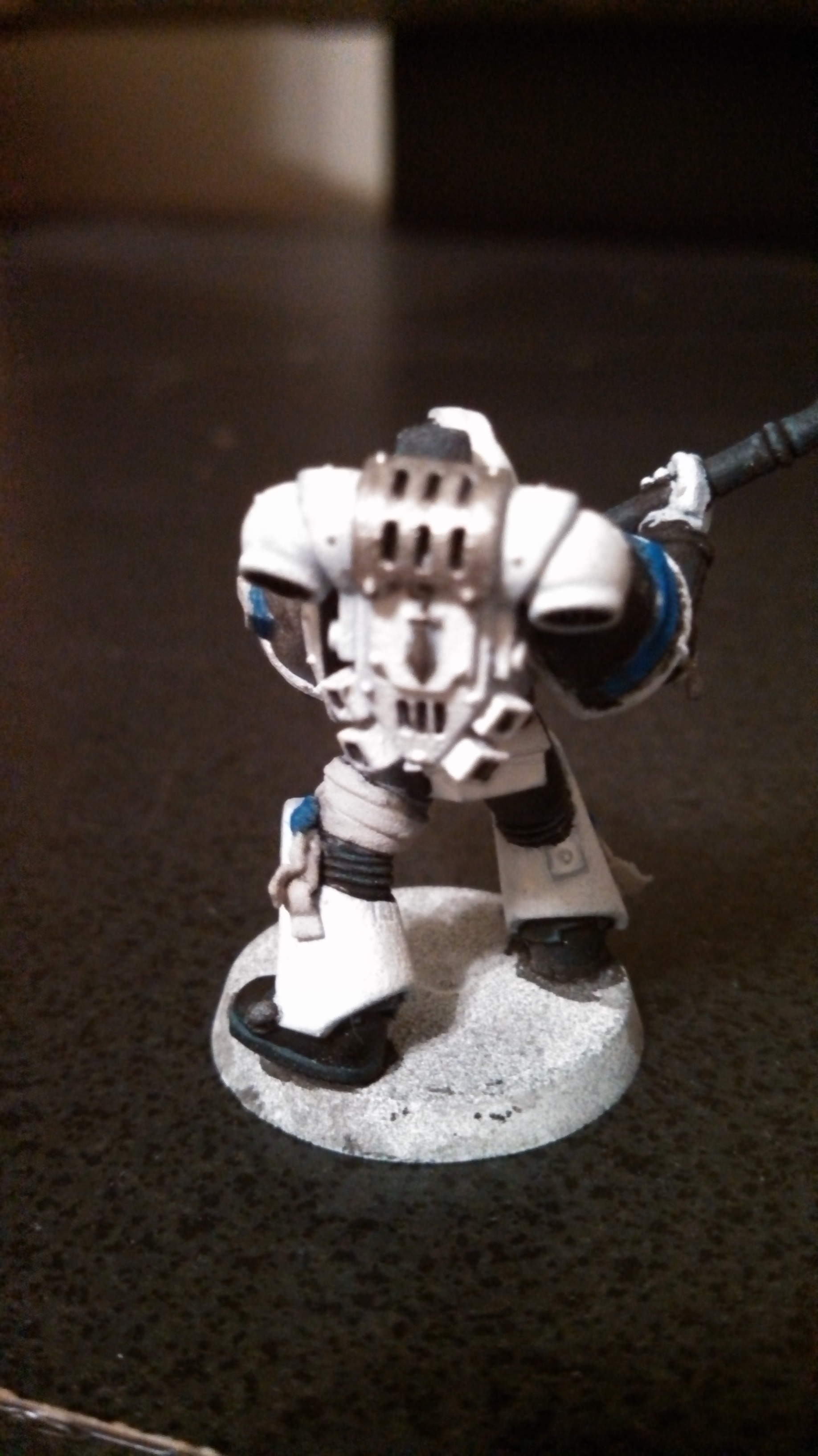 1) The white: Judging from the base of the model you primed it with a white spray, to get some nice depth you should then use a black wash around the crevices in the armour and then