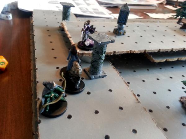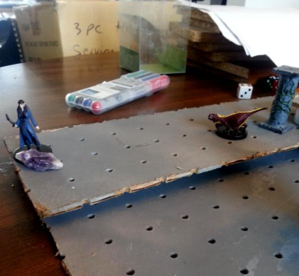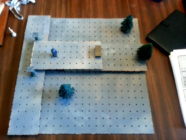 This is the board I threw together. It is cut pieces of pegboard stacked on tea candles for elevation. I threw on a few random terrain peices I had handy to finish it off.