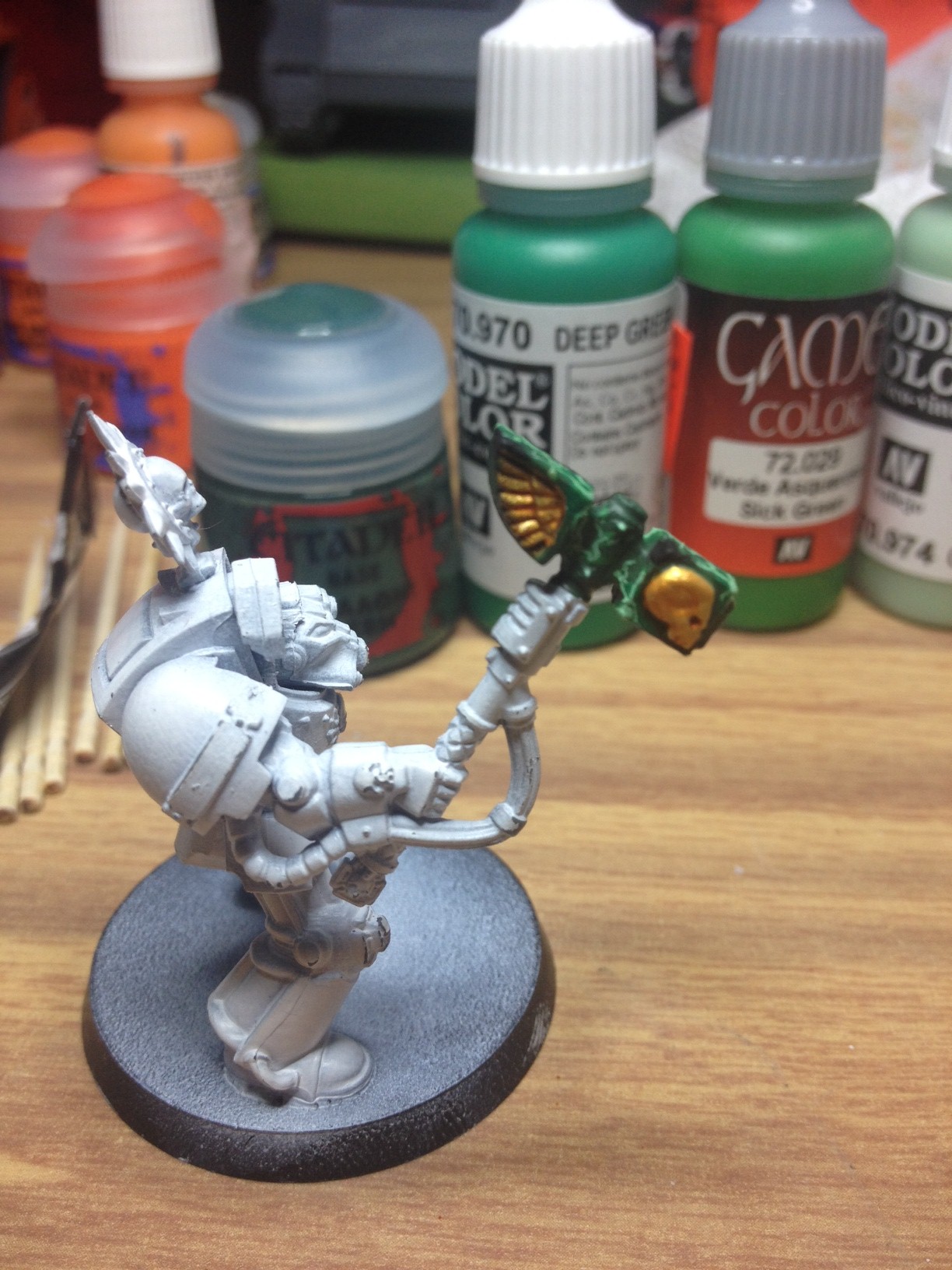 Here i have Kantor after many hours of painting and some time off simple greening 4 tac squads of their base coat and primer. but they are almost clean and then its off to trimming the mold lines that i missed. The back pack is on a tooth pick waiting to be primed and painted, i am just at a stalling point because i do not have a chapter symbol yet. I do have a motto but no symbol.