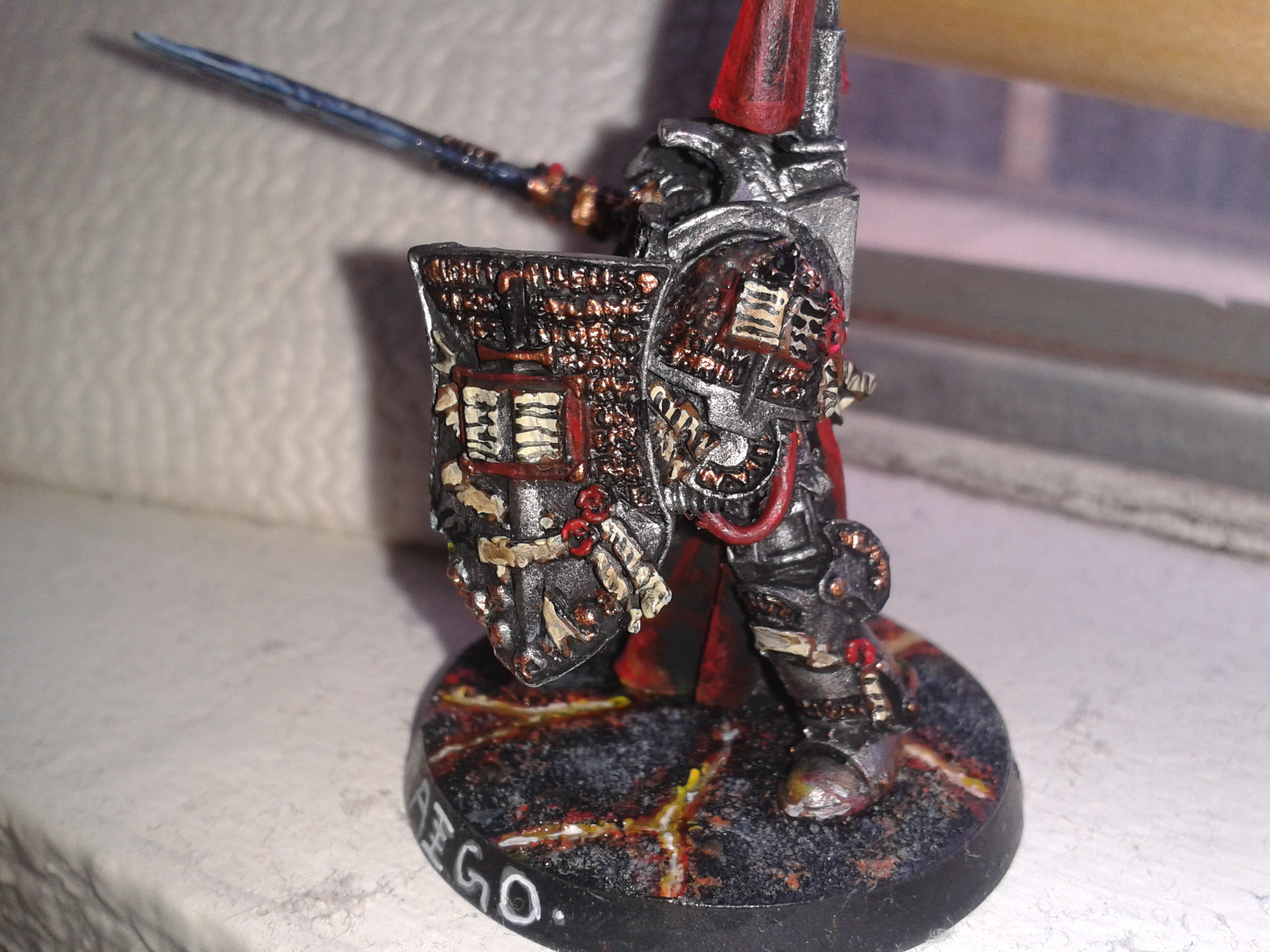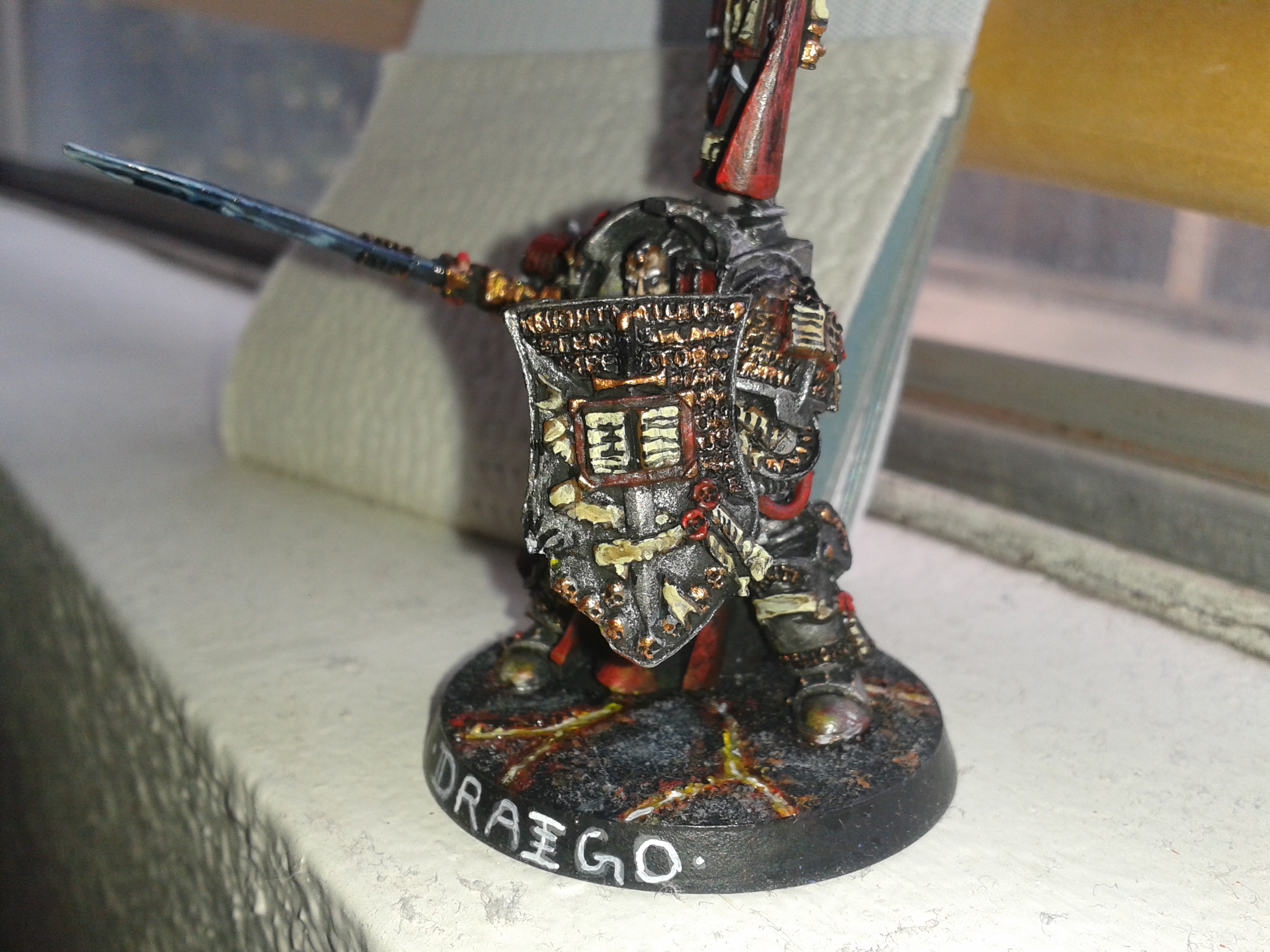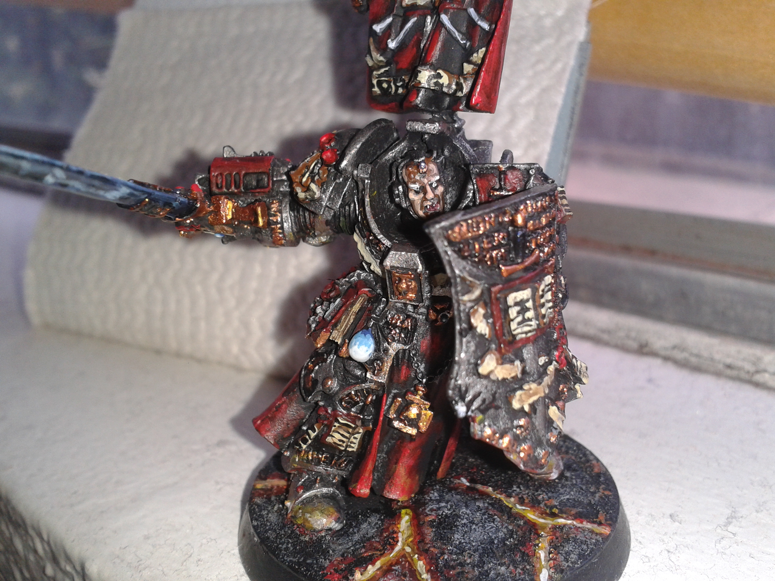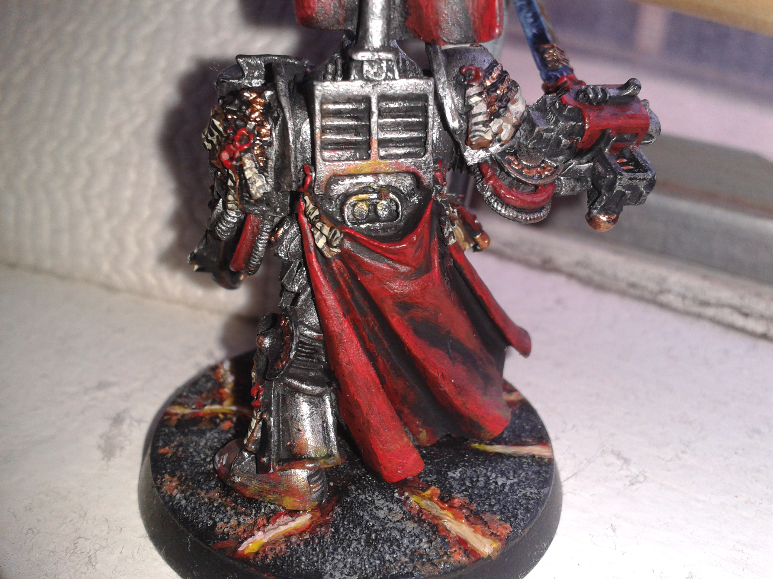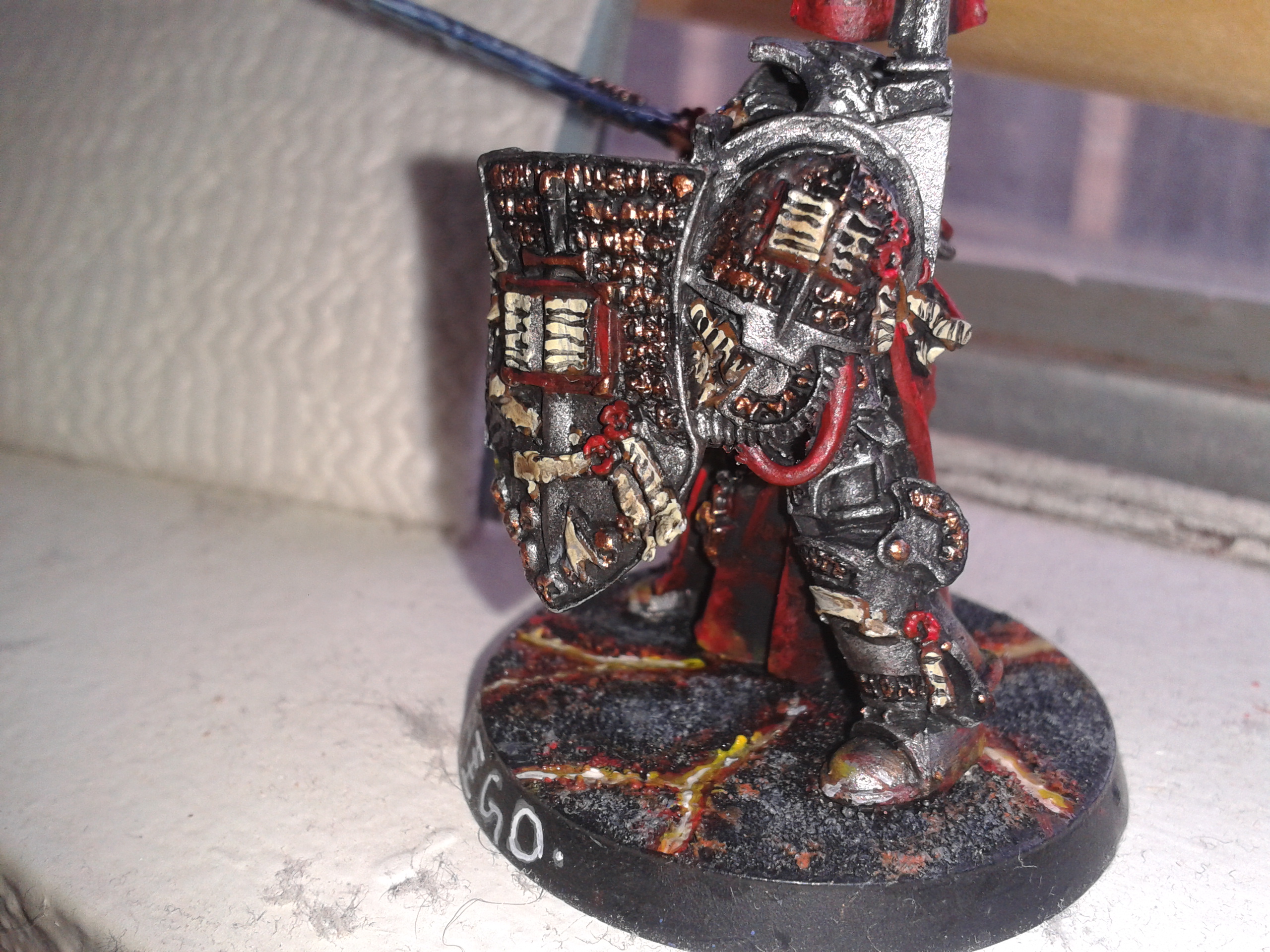 I like his sword and cape, altho both could use a little bit more high lights. now to the armor... there is really no change across the whole model, its to plain and to grainy. way way to grainy, i would sugest you use an edge highlight, rewash it to try and get some of the grain off of it and then work in some more red and briten up your gold.
