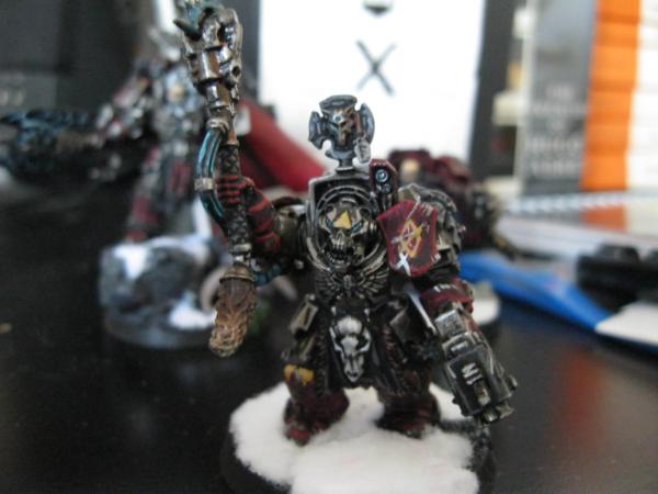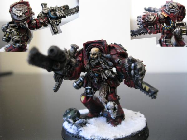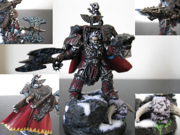 In regards to the head questions, I bought Forgeworld Khorne Lord Zhufor and used that as the base for the wolf lord (hence the spiky legs), then I replaced the torso for one from the Forgeworld Space Wolf Terminator upgrade kit. The Lone Wolf's torso is also from that kit. If anyone can remind me where his axe comes from actually, that'd be great, because I can't for the life of me remember what kit it came from, haha! And yes, as TheFatElf said, the head of Ørnstein is the alternate helmet you get with Zhufor!