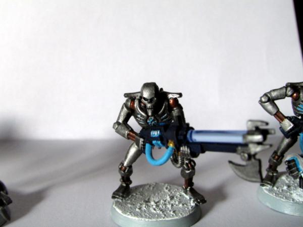 These were my first real challenge. I just couldn't figure out how to paint them. I wanted to give the impression they were more badass, much more "colder", but I had no idea how. Thankfully my FLGS owner helped once again! 50% leadbelcher + 50% Vallejo silver. After that, Blue Glaze all over the miniature to give away a "cold metal" feeling. This is now my "Living metal" scheme. I also added much more blue to show how they were much more important than the lowly warriors (but still not important enough for warm colours):