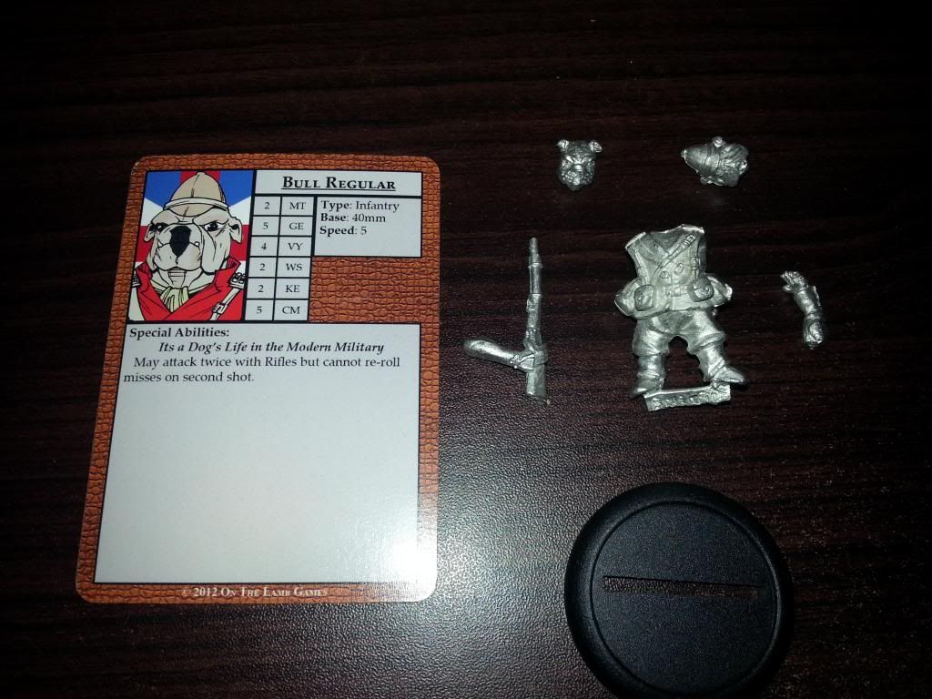 I duck home to my parents house upon rumours of a mysterious box appearing. Lo and behold, it is from OTL games. Huzzah! I'll post pics when I get home from uni and can start painting (preparing for assignments? Bah! Bull Regulars!). And thank you very much for the dice, they were a wondiferous surprise Here we go! The box as a whole just opened (sort of, I couldn't resist having a peek at the bulls) The Heavy Brigadier One of the Bulls (didn't feel the need to take 5 of these, I'll wait until I start painting)