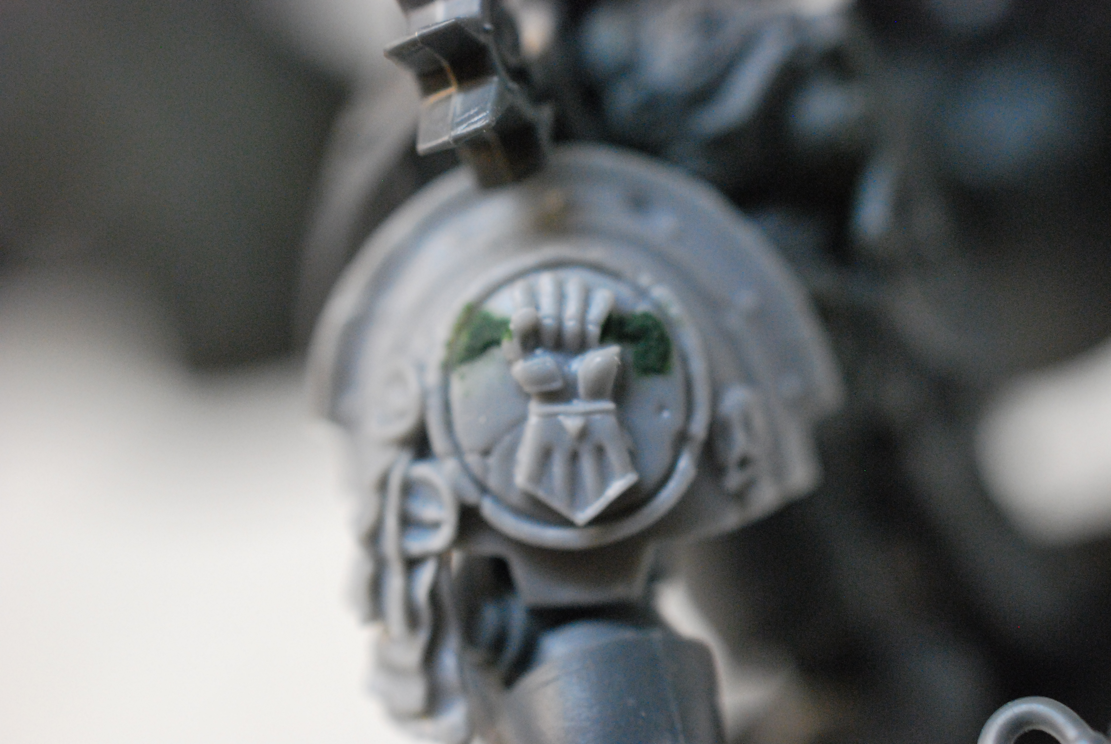 So, a quick break from Tau, I'm finishing up these terminators. I've finally decided on a symbol. I have terrible free hand skills, so I picked a symbol I could modify a little. That brought me to the idea that could use the imperial fists symbol, but holding a key as well.