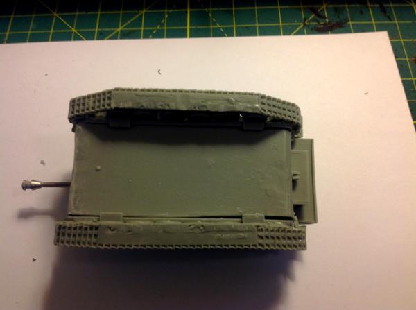 The model, held together with a glob of putty. The tracks seem to be straight, but the bottom of the hull tapered a tiny bit towards the back and bottom. The gap was much less pronounced from the front and back and almost invisible from the top, and some liquid green stuff covered it from all angles except the bottom. There was a slight gap between the right tread and the hull superstructure that became more readily apparent after painting the model.