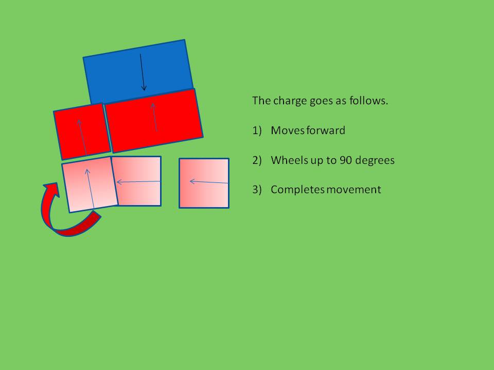 In another example, your unit is charging an enemy unit with nothing in the way.  However, the angle is funny.  Regardless, you CAN still FULLY maximize, meaning all of your models can get into base-to-base contact.  You can make this charge, but you MUST use your single wheel and close-the-door moves to ensure that all 5 of your models are in base-to-base at the end of the charge.