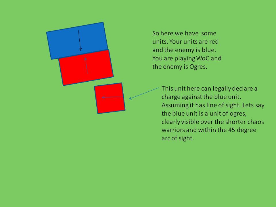 A friend and I can't quite agree on how charging and wheeling works. Basically, I wanted to charge his Stone horn with my Skullcrushers, however there were a group of Ogres blocking a direct straight ahead charge. At the time we played it that the most I could do to get around them was charge straight along the edge of my unit's line of sight (so basically a 45 degree angle from when they started), this resulted in the Skullcrushers clipping the ogres and hence failing the charge. What I'm wondering is, could I have wheeled more as I charged to avoid the ogres? When played it that I couldn't wheel any further than the unit's initial line of sight arc, but could I have?