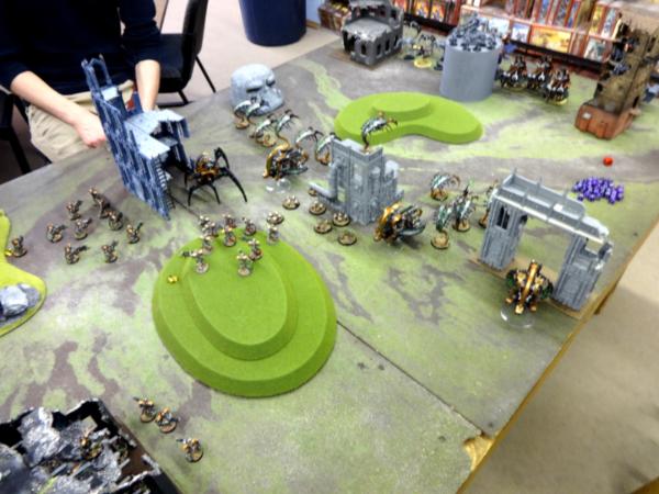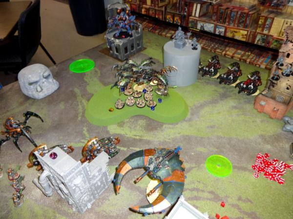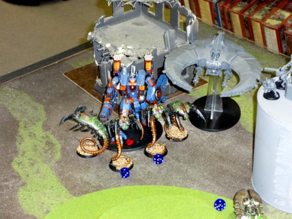 The destroyer lord and wraiths move up, meanwhile a massive riptide class battlesuit gracefully positions itself to rain destruction on the wraiths.
