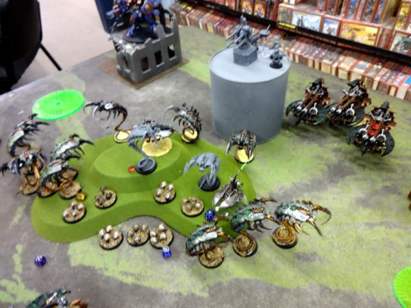 The two Night Scythes are both in play, one lining up my scarabs where the ruined parts of their barges lay. The other would fly towards the Bedouin Side of the field.