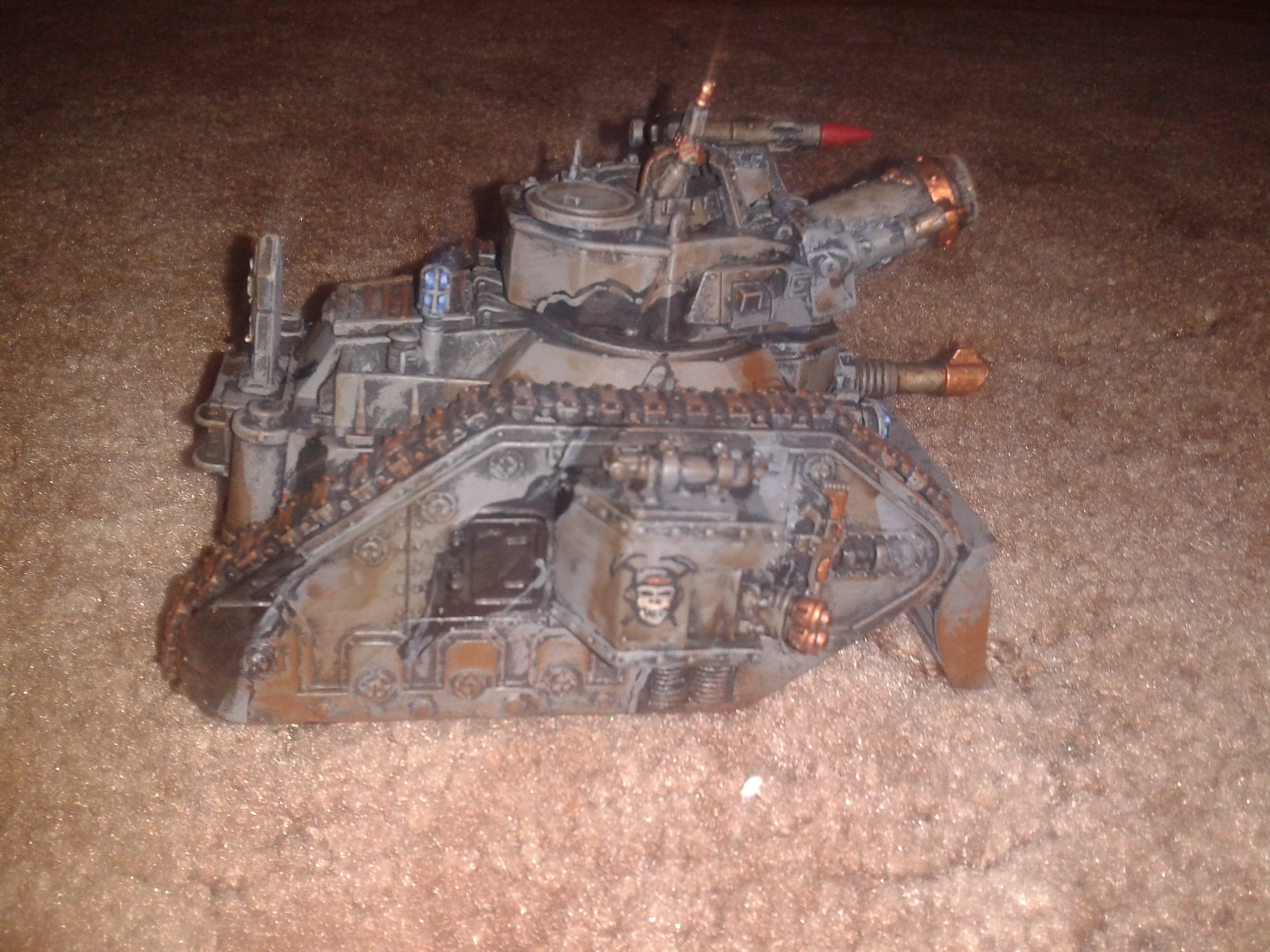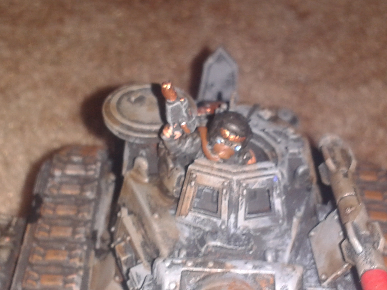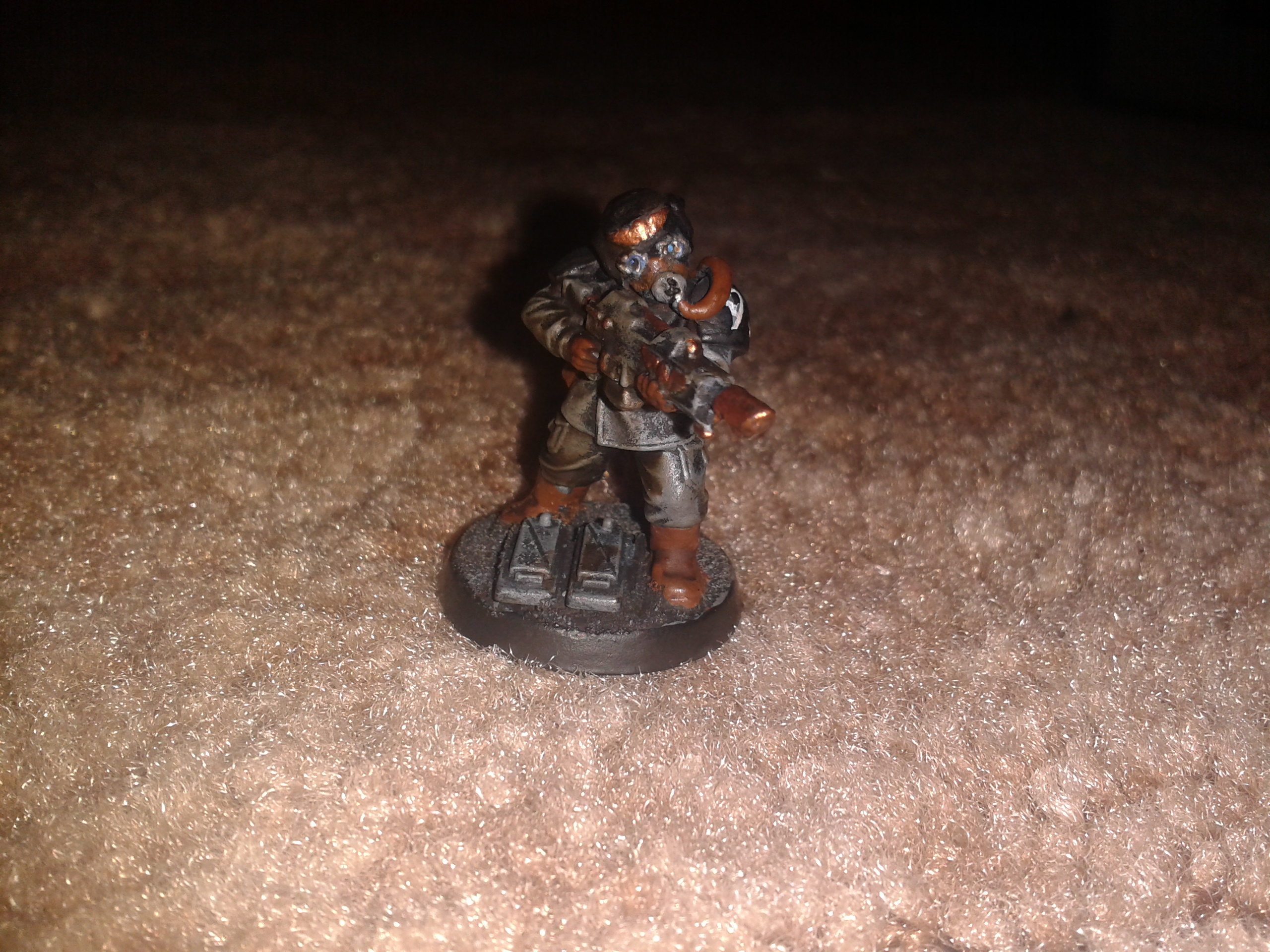 Ok guys, I got bored of my catachans so I'm starting a new IG army. These guys come from a mining planet and are expert urban and night fighters. I'm basing them on cadian models but with gs gas masks. I got a free trooper from a buddy, but I'm still looking for more grunts right now. The tank has been converted quite a bit and now has an hk missile, dozer blade, lascannon, and heavy flamers,as well as a small machine spirit shrine. Hope you guys like, if you do, I might make a PM blog.