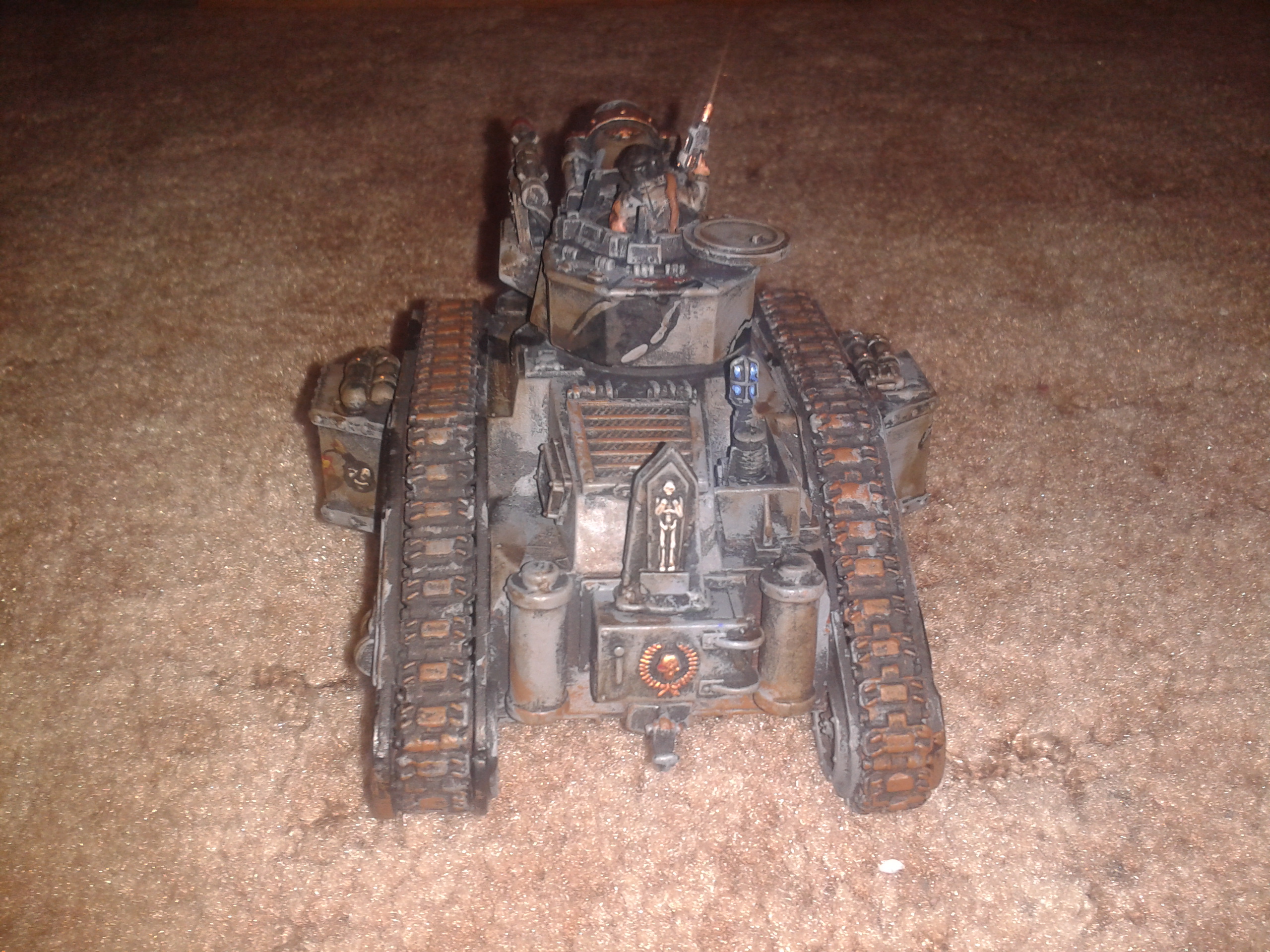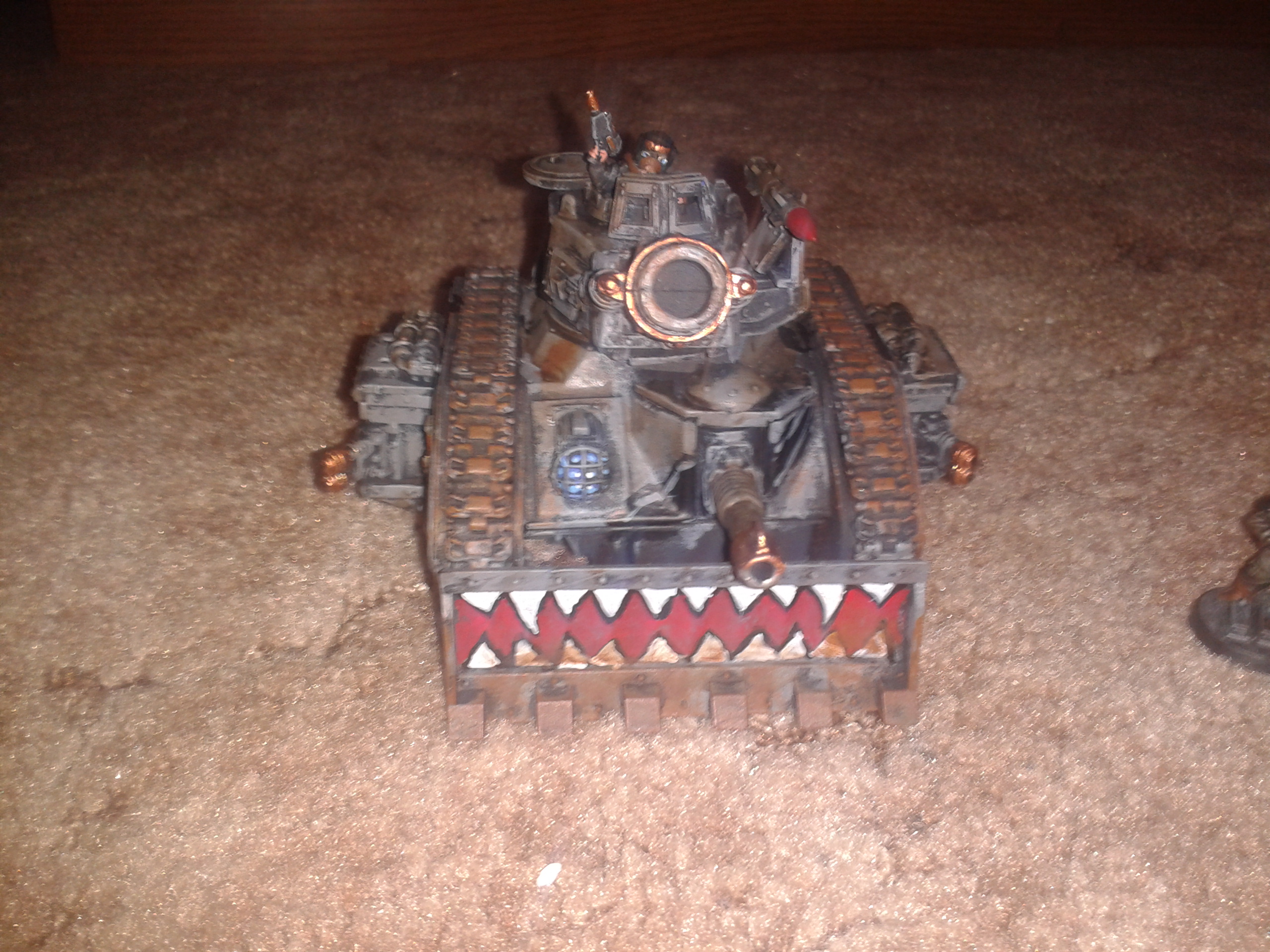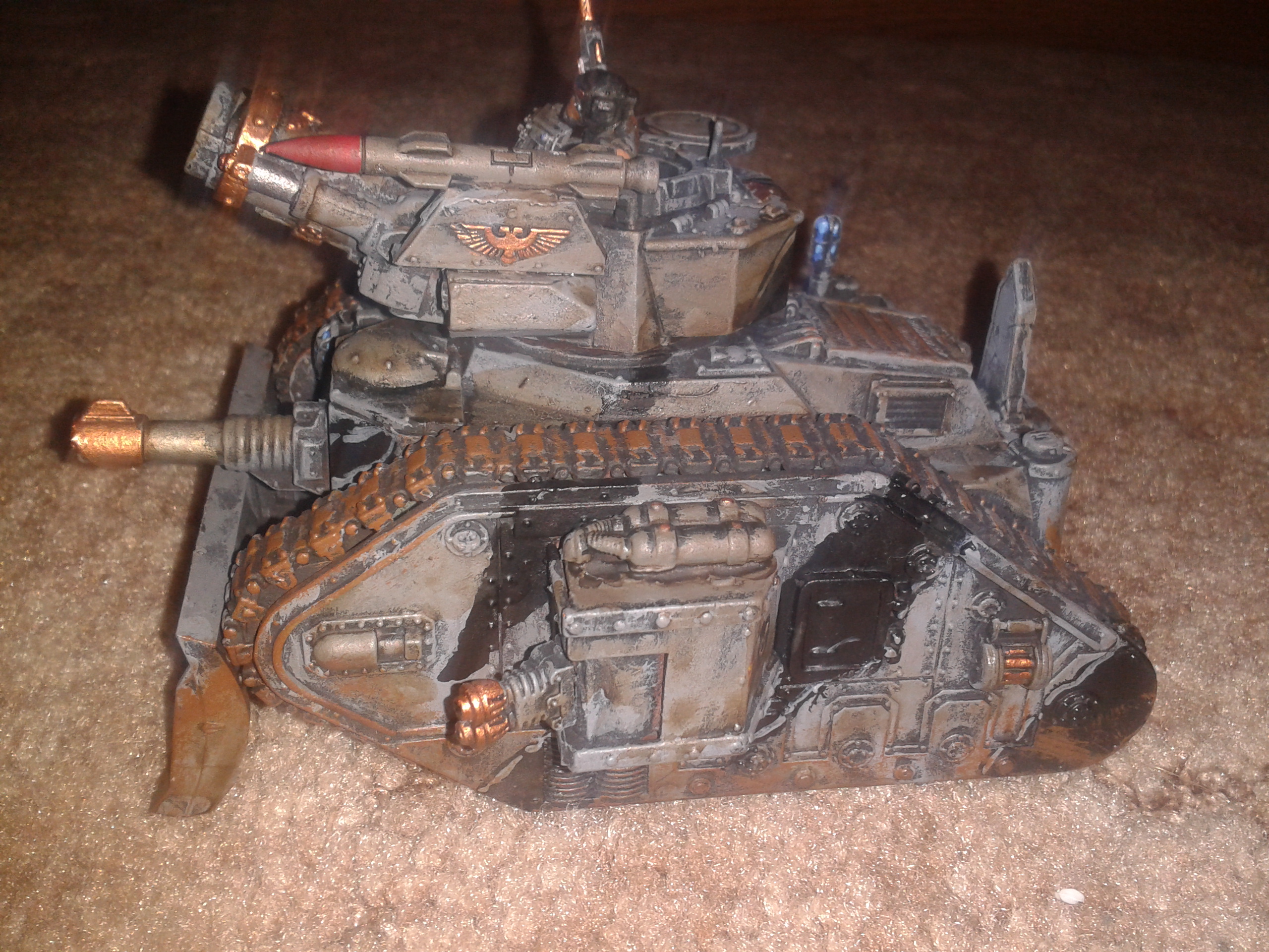 Ok guys, I got bored of my catachans so I'm starting a new IG army. These guys come from a mining planet and are expert urban and night fighters. I'm basing them on cadian models but with gs gas masks. I got a free trooper from a buddy, but I'm still looking for more grunts right now. The tank has been converted quite a bit and now has an hk missile, dozer blade, lascannon, and heavy flamers,as well as a small machine spirit shrine. Hope you guys like, if you do, I might make a PM blog.