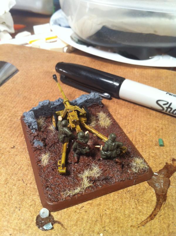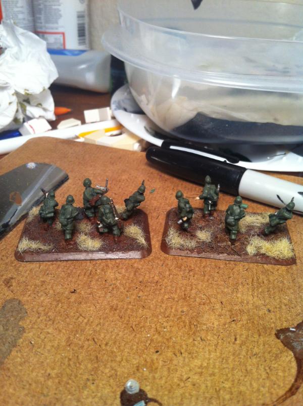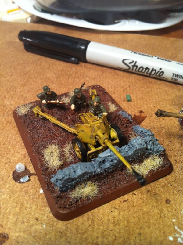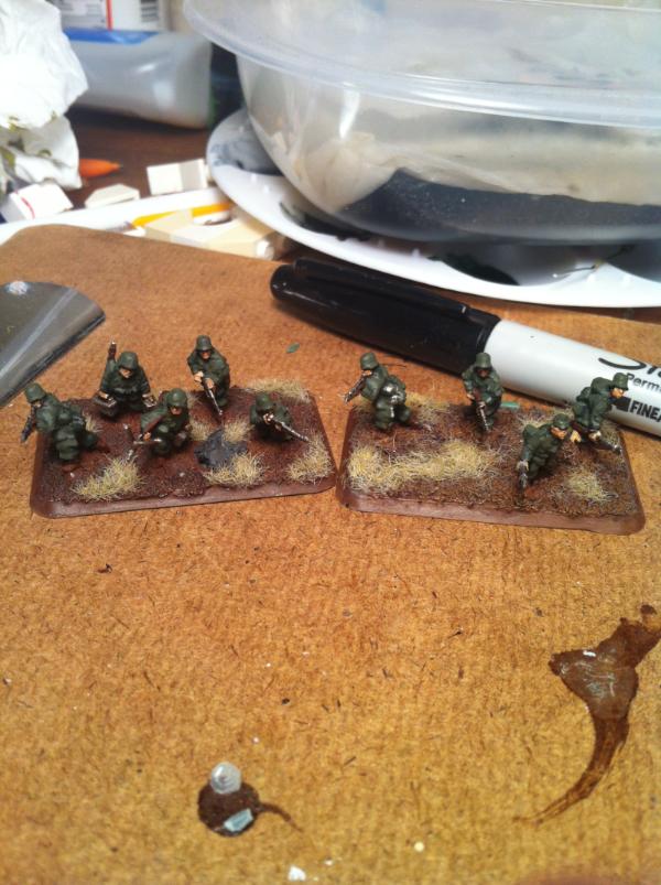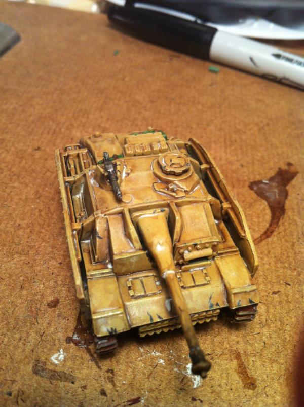 Here is the first batch of mini's I've painted from the starter kit of flames of war (something not usually seen on here!). Painting at 15mm scale seems to focus much more on atmosphere and overall style than individual model quality because of the tiny size. For that reason I am looking for some feedback on whether or not the German yellow w/dead static grass combo looks good, or just repetitive. I was trying to make the Germans look "evil". Should I switch to green grass with a lighter dirt color? You can also see on the Stug where I applied too much varnish - I'm still experimenting on that front. It's not so obvious in person.