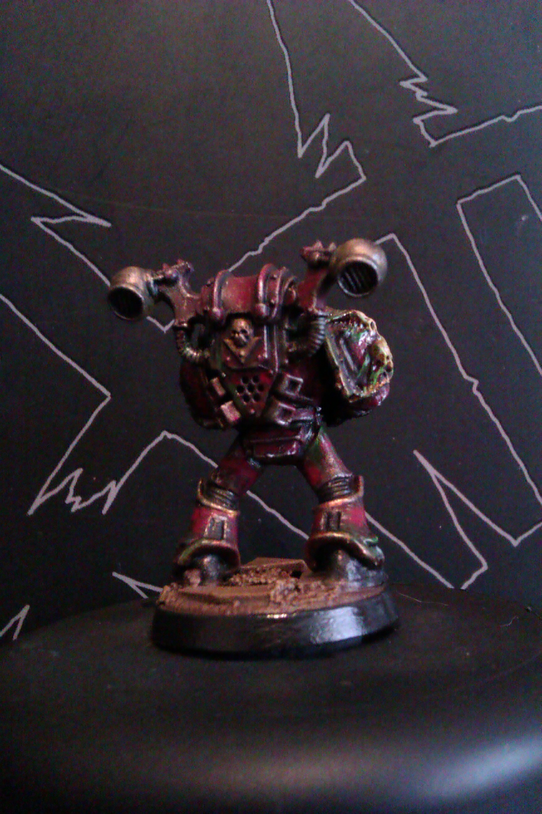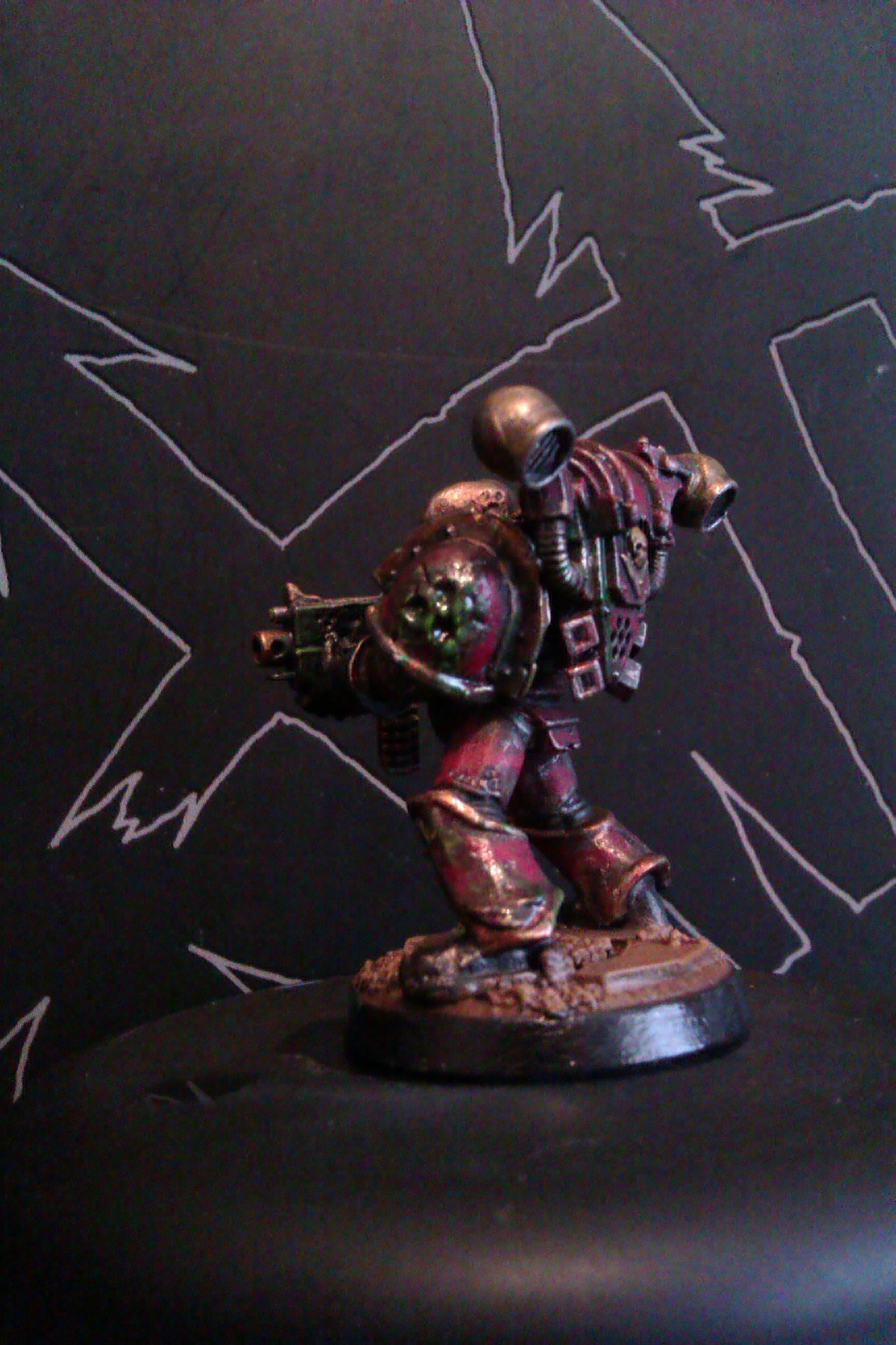 After that was done the rest was a simple and easy modification of the mini, Chaos Nurgle pad slapped on shoulder, Dark Vengeance Lord pack attached to back, spare bolt pistol on waist, half a guard flamer pack strapped to other side and some carefully dremelled holes and cable wire added to fill in the gaps around the pack! I left the base simple as there is already more than enough detail on the model itself.