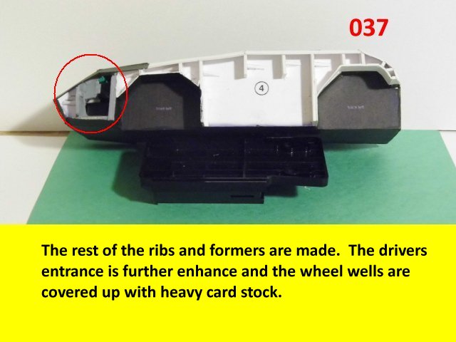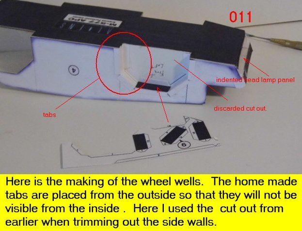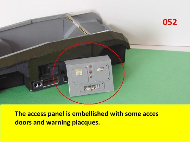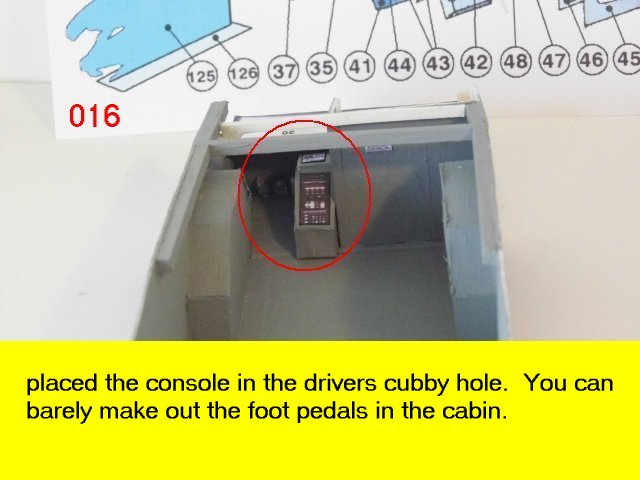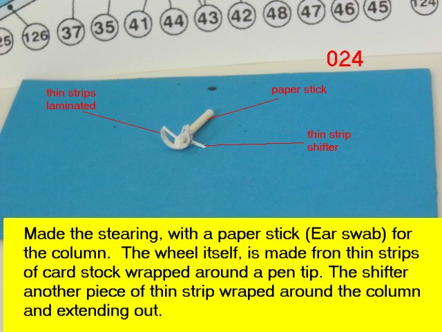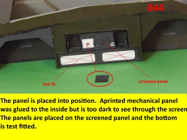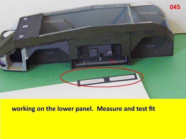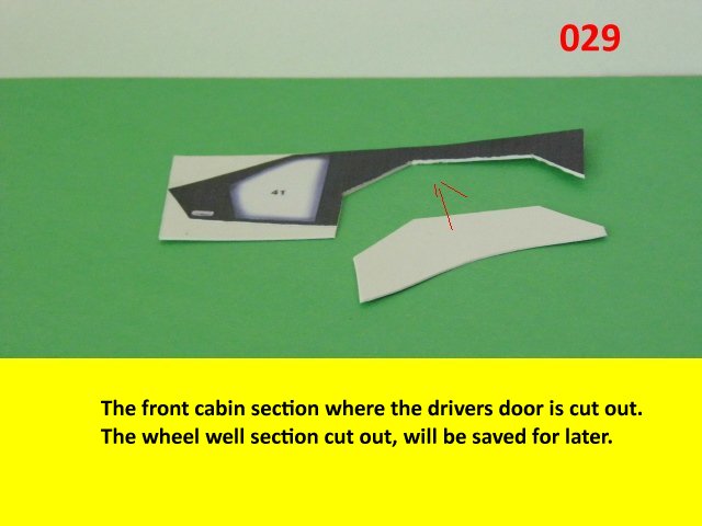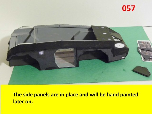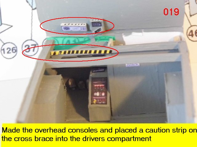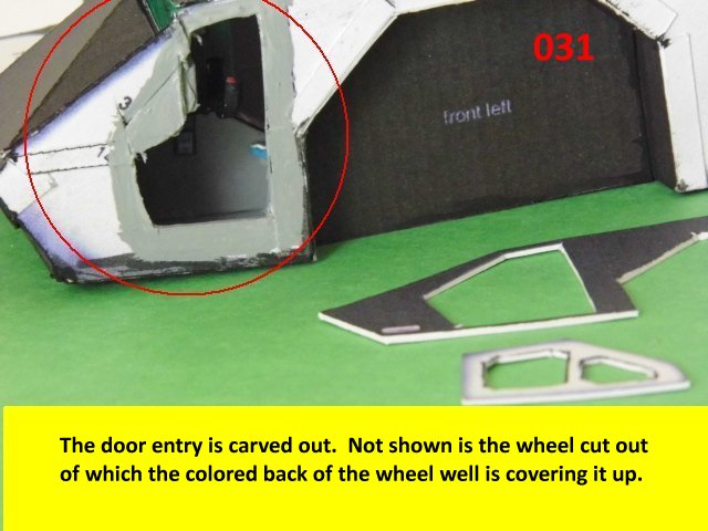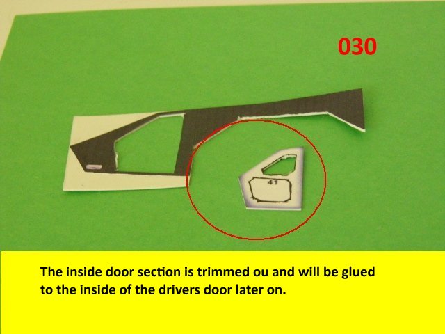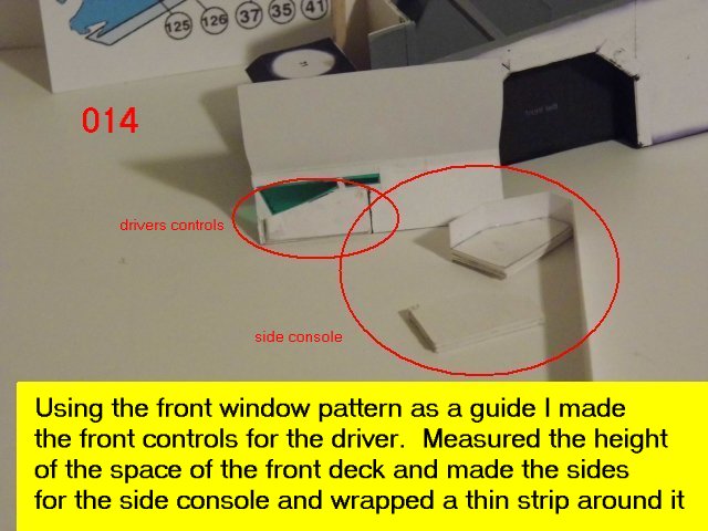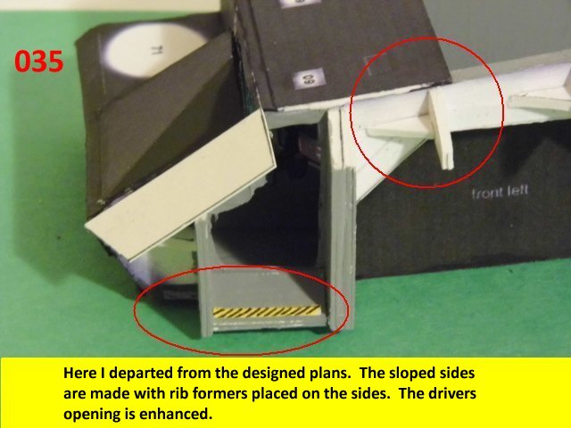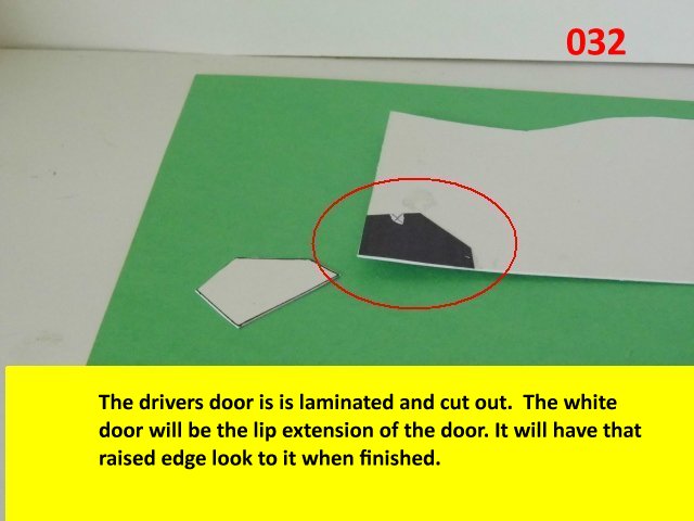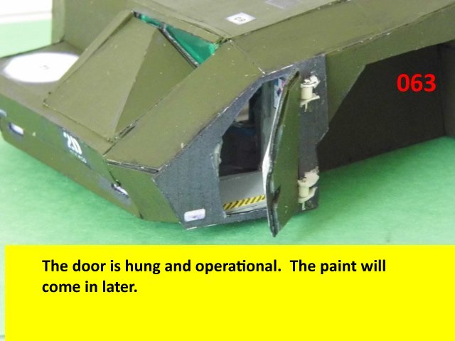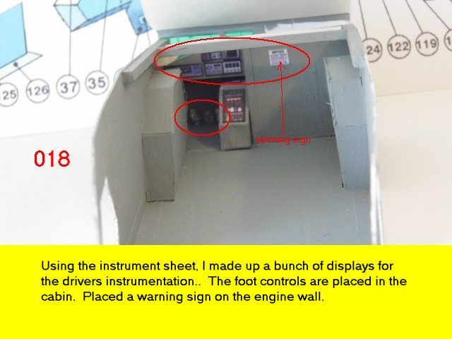 Here is the next batch of photos. The drivers door is constructed and it will open and close. It also allows a view into the inside drivers cabin that cannot be seen when the top is removed. I find that making the door this way, is easier than folding those teenie thin tabs. The last photo is of schematics that I use for the instrumentation, displays and warnings. Print the instrumentation page on lanscape for this model and in portrait for Jans original version. Enjoy and see you all next posting