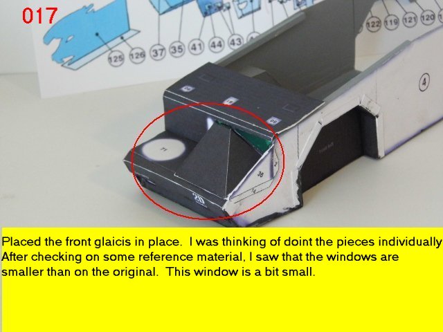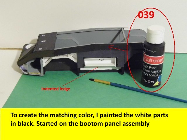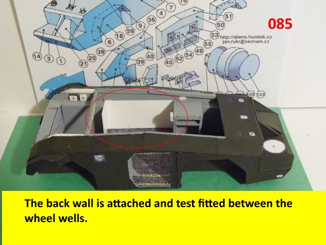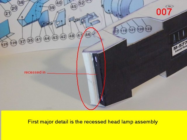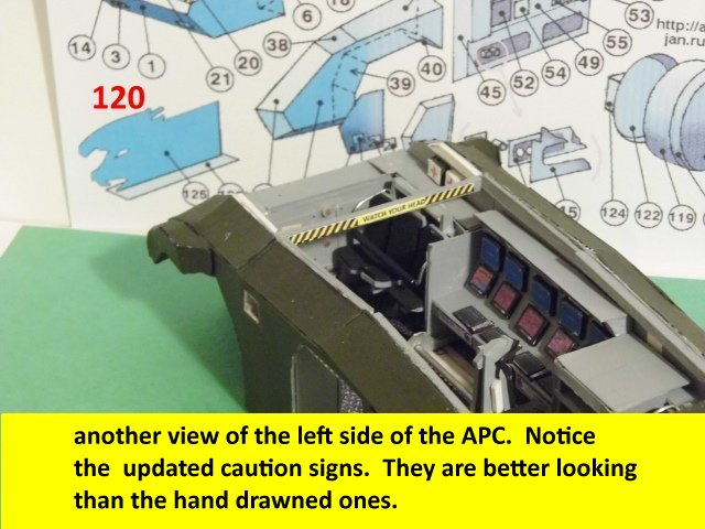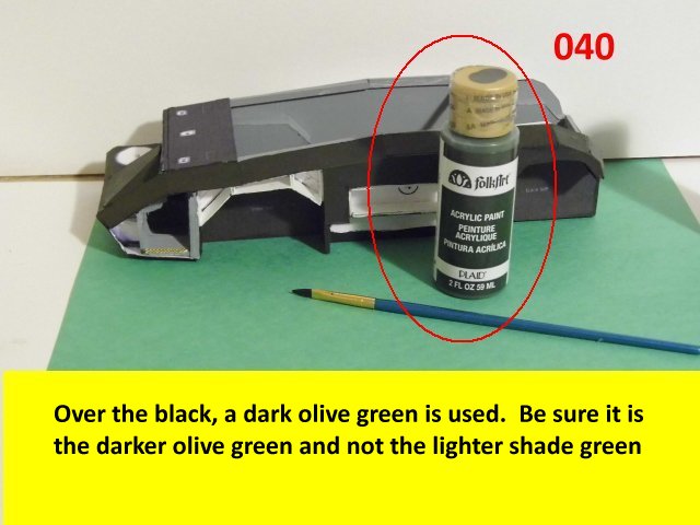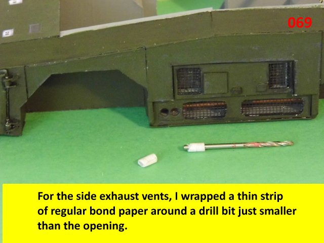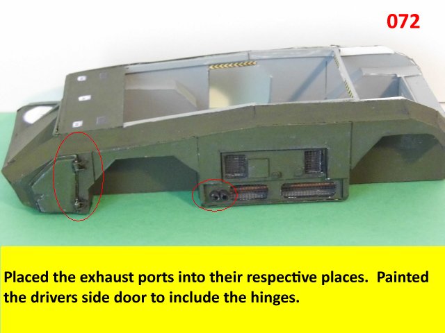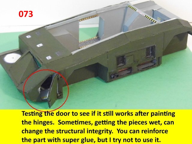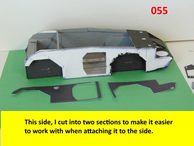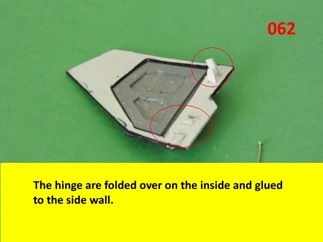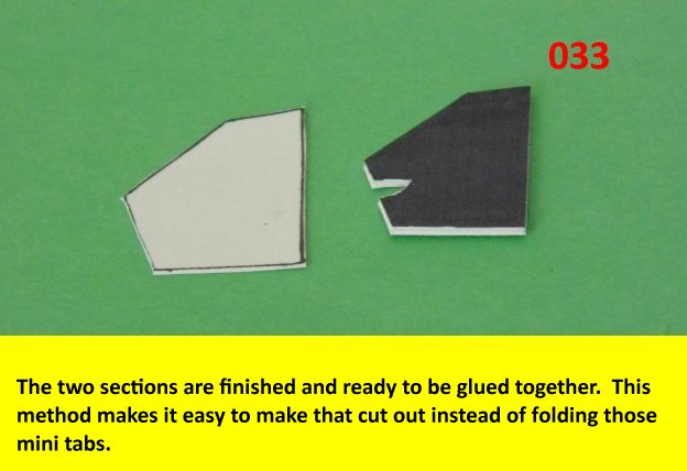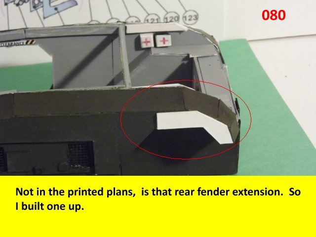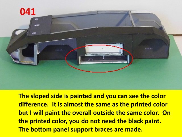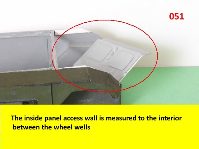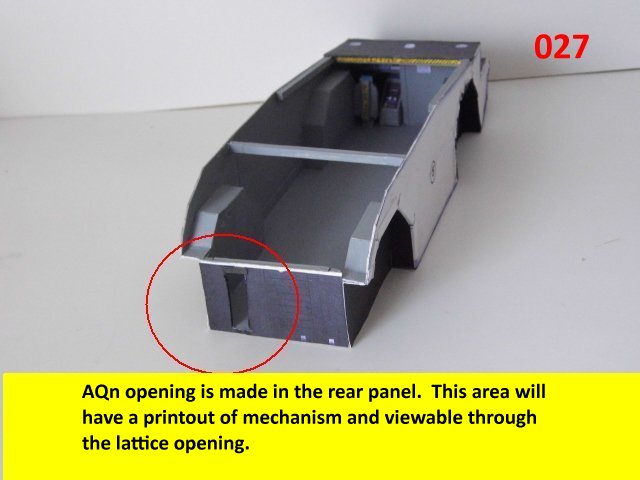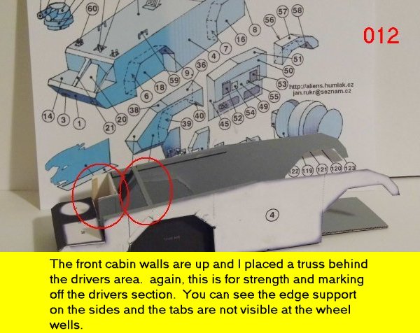 Here is the next batch of photos. The drivers door is constructed and it will open and close. It also allows a view into the inside drivers cabin that cannot be seen when the top is removed. I find that making the door this way, is easier than folding those teenie thin tabs. The last photo is of schematics that I use for the instrumentation, displays and warnings. Print the instrumentation page on lanscape for this model and in portrait for Jans original version. Enjoy and see you all next posting