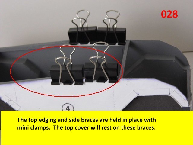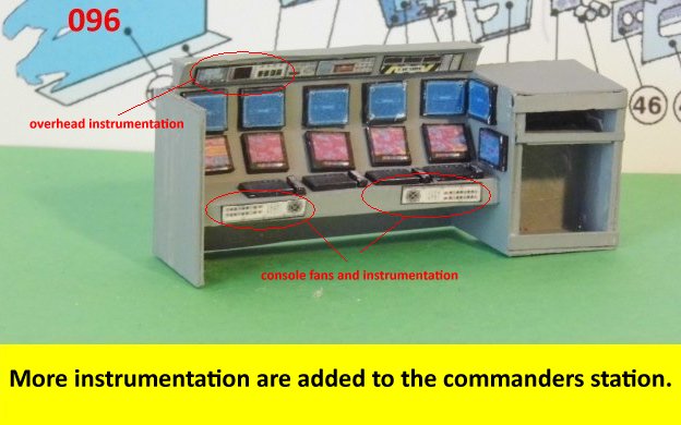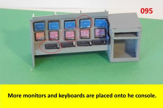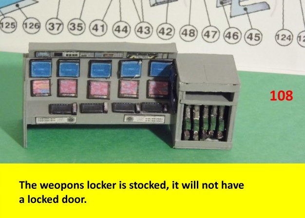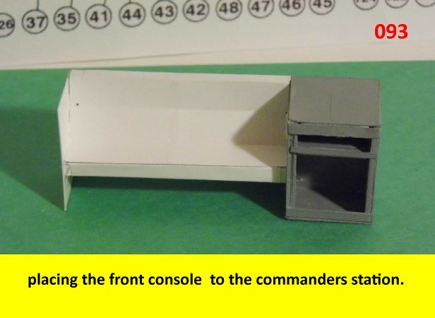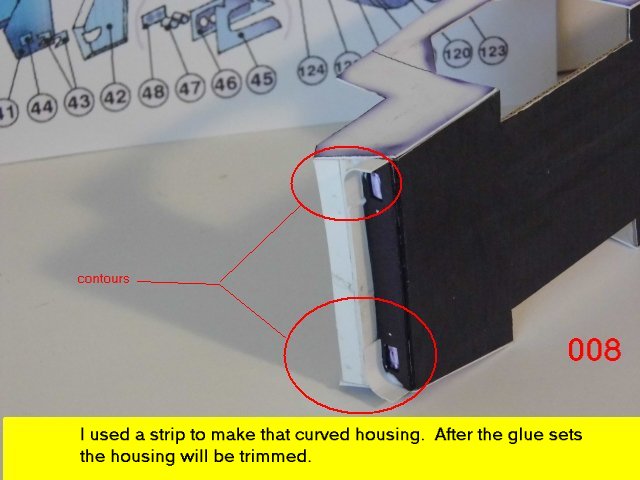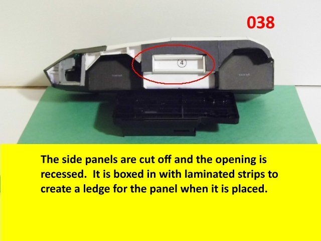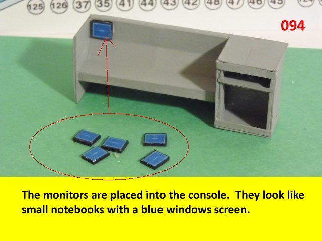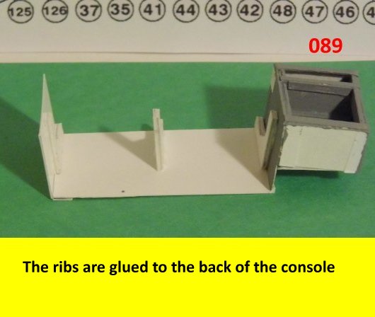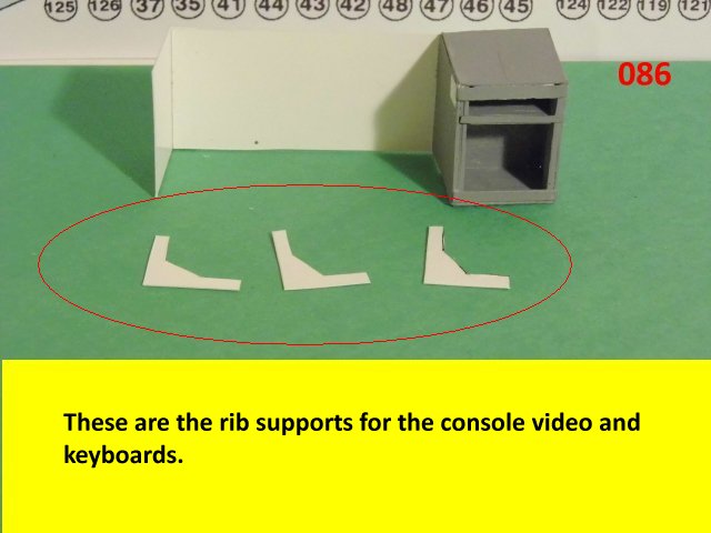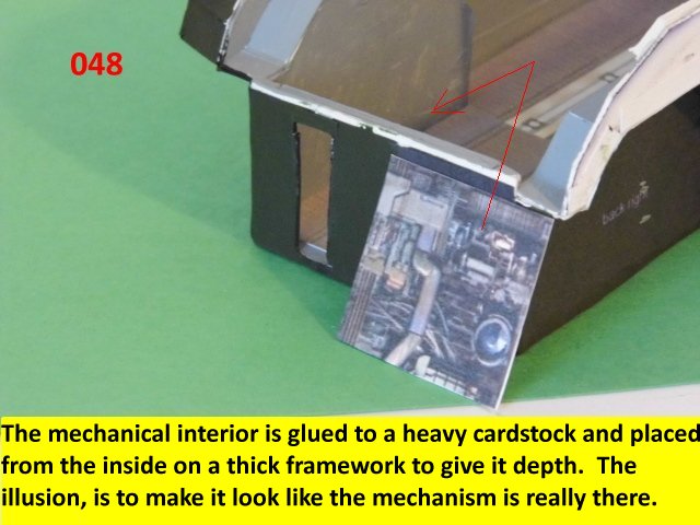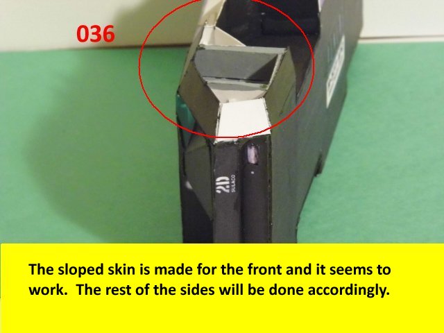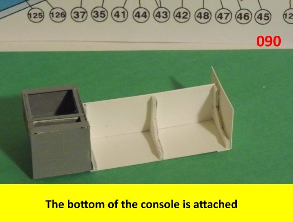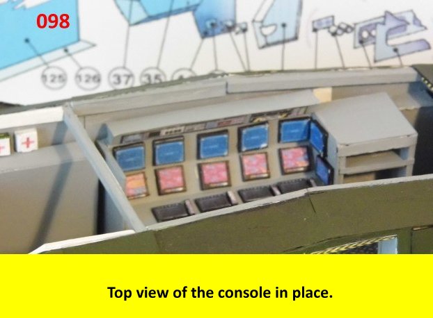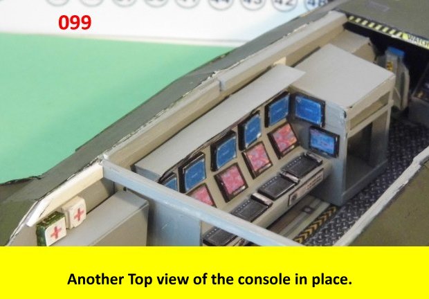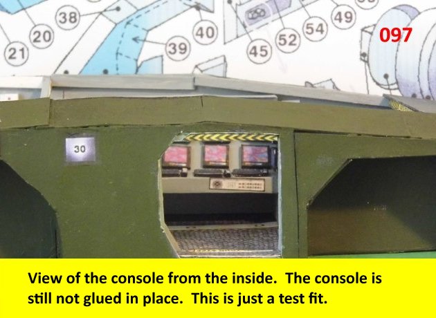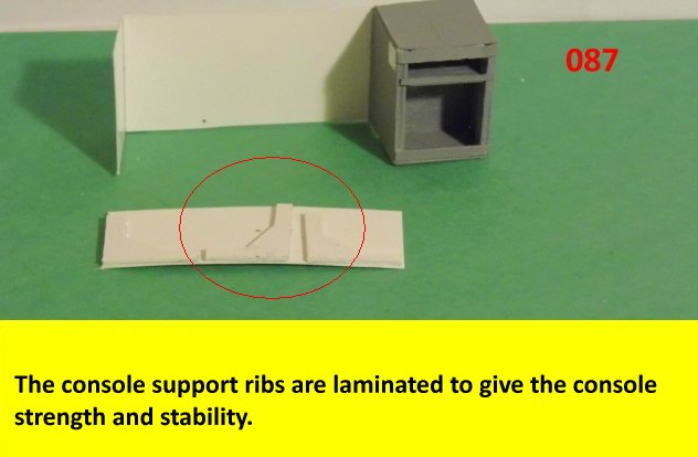 Here I deviated from Jan's plans, in that the sloped sides are scratch built. I made a laminated rib support for the sides and for the mechanical panels. The skinning panels are made from cardstock laminated 2X. This gives the model a very sturdy construction on par with a plastic model. Enjoy and see you all soon with more updates. BTW the main console is finished and it looks great. I am working on a slide mechanism for the console operators chair.