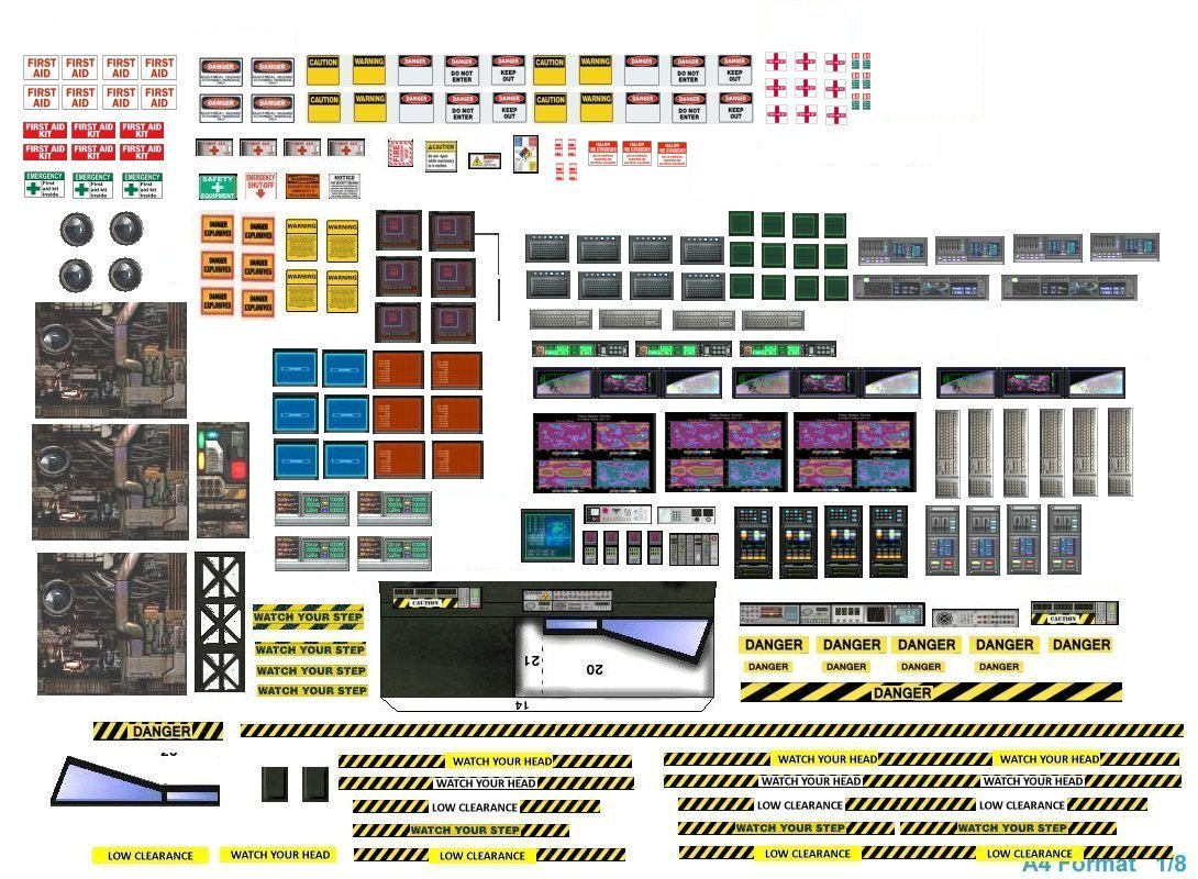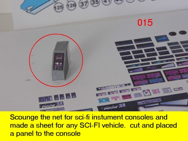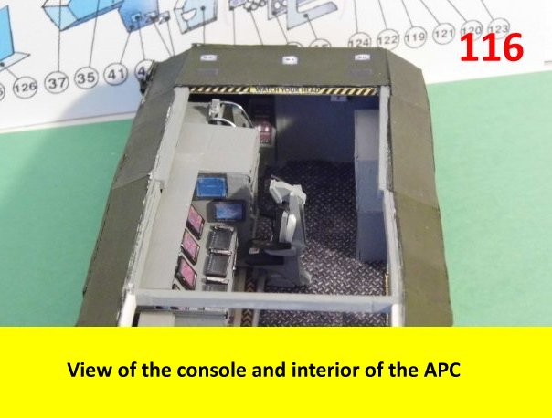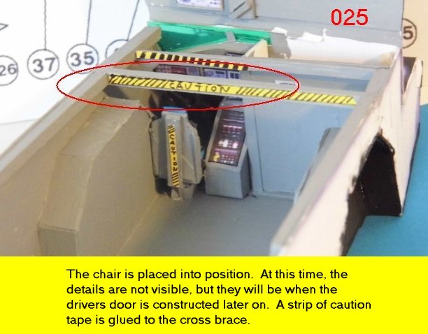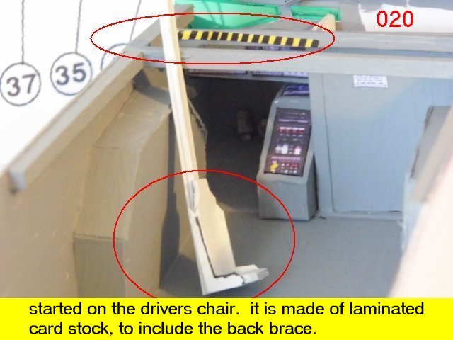 More scratch built stuff. most of the caution labels have been redone and look much better now. the steering wheel is glued to the bottom of the console ledge. The troop chairs and the operations console officers station will be a bit more different than the drivers seat. Enjoy and see you all soon with more updates.