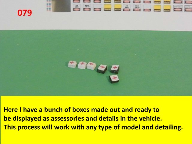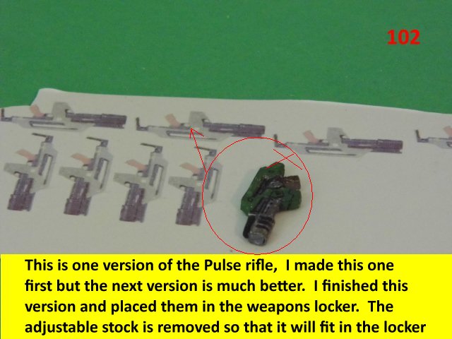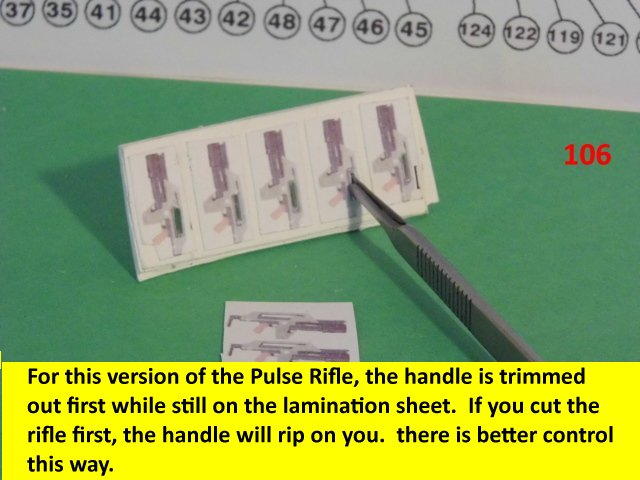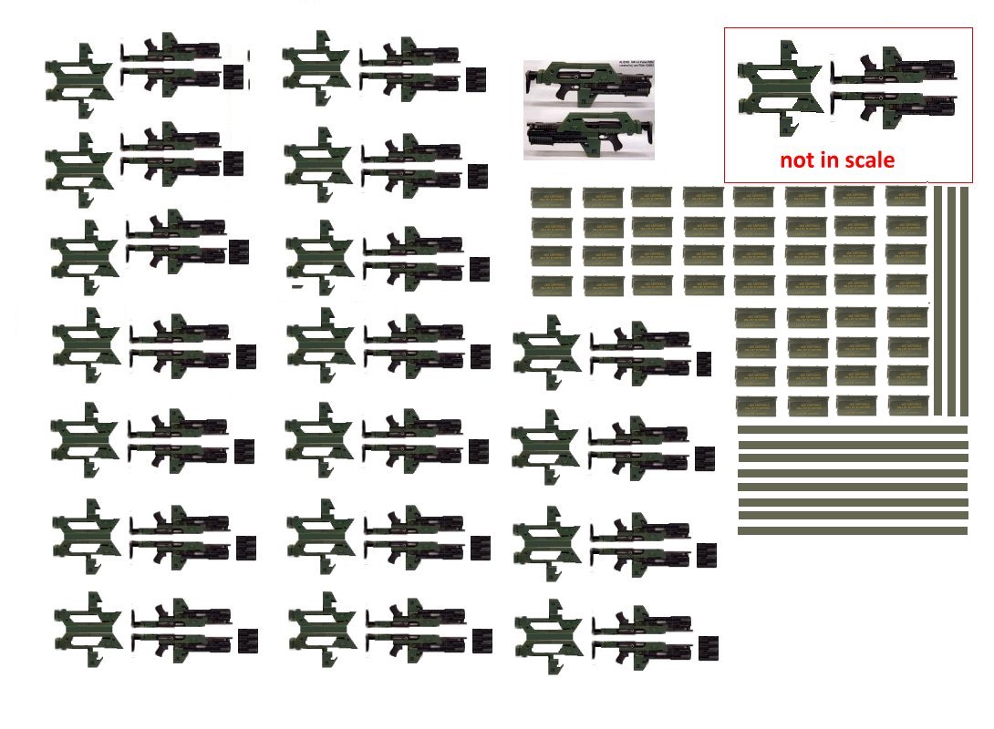 Here is a small tutorial on the making of laminated pieces. It stands true for thin or thick pieces. It cuts down on making fiddly little tabs and gives you a solid piece to work with. Here I made some first aid kit boxes but with the same technique, I also made some ammo boxes. With this method I made the crossbeams and the structures for the seats. The only thing holding me back is more imagination. The last photos are of some c-ration boxes the Pulse rifle with the ammo can sides. These pieces are laminated to the required thickness. The c-ration boxes can be laminated and the printed part wrapped around it but it folds like the real box. The parts are set for landscape and are about 1/35 scale. if they are oriented to portrait size, they will be about 1/48th scale. They can be used for other dioramas or details other than the ALIENS venue. Enjoy and see you all next posting.