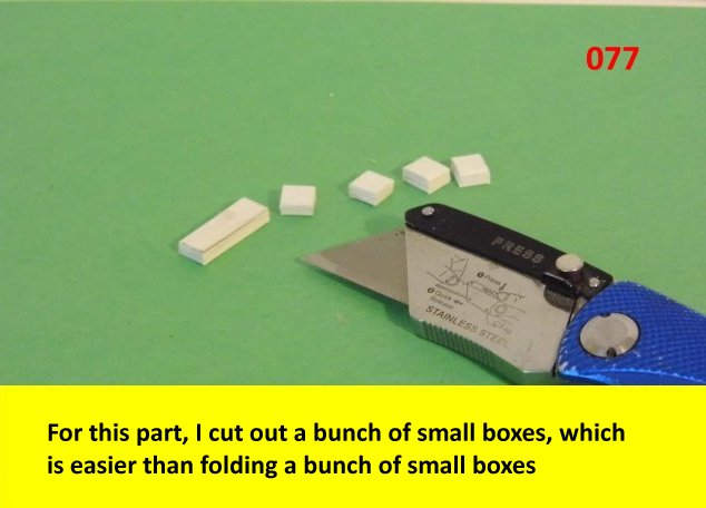 More updates and the one that some of you have been wondering about. For the door, I used 120lb cardstock for the flat part of the hinge. I was going to make them out of brass but decided to try it out of paper. Be sure to cut the slots out first, before cutting the side panel out. It will give you some surface to work with and make sure that you do not cut all the way trough to the edge.