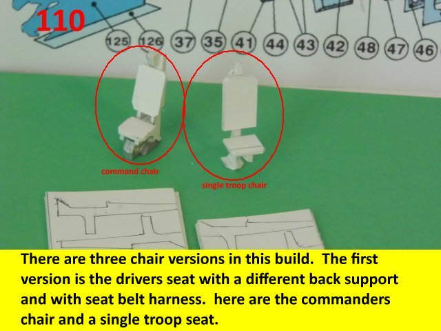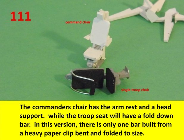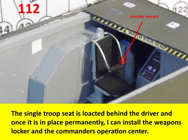 Here are the updates on the seats. This model has three different seat versions. The first one was done a while back while doing the drivers station. Here the construction will be on the commanders seat which will have a head rest and arm rest. The configuration is also different. The single seat version will adapt to multiple seating capacities. Next posting, there will be a build sequence on the troop seat construction. Enjoy and see you all next posting.