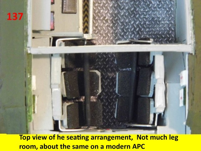 Here is a follow up on the seating arrangements. One thing I did not mentioned. is that I drill a hole near the top to insert the safety bar clip. The C-ration boxes are the old style, I will upload the MRE large box later on in the build. Enjoy and see you all next posting