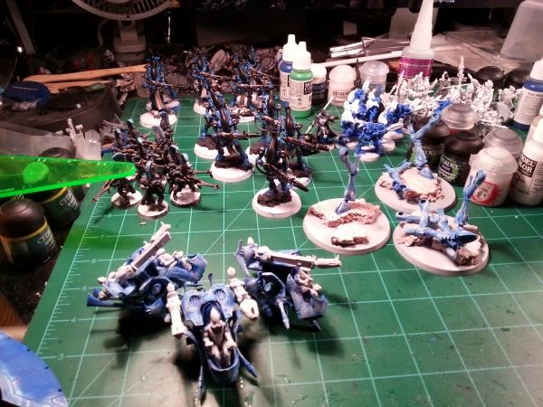 Looking forward to seeing the new Eldar painted. I agree with the request for blue variation, although I must say I like the blue striations (streaks) on that scattershield, though I'm not sure if they're intentional. I just thought of a crazy idea of doing the blue as blue marble (black/blue/subtle white streaks) from looking at that scattershield's markings.  A play on the Alaitoc scheme, so to speak.