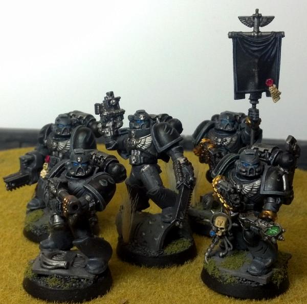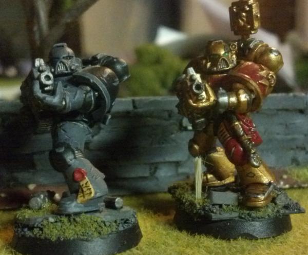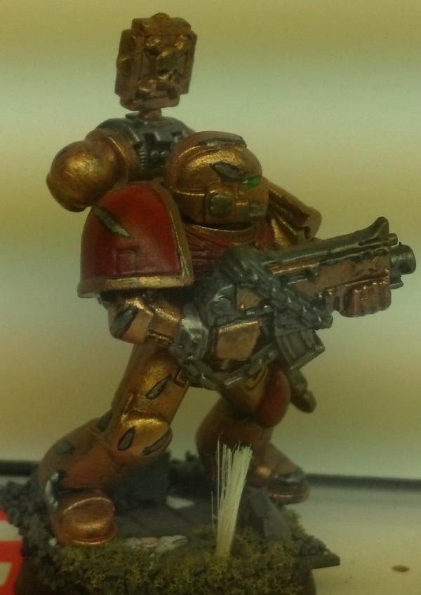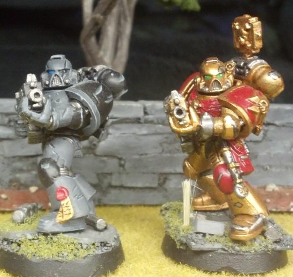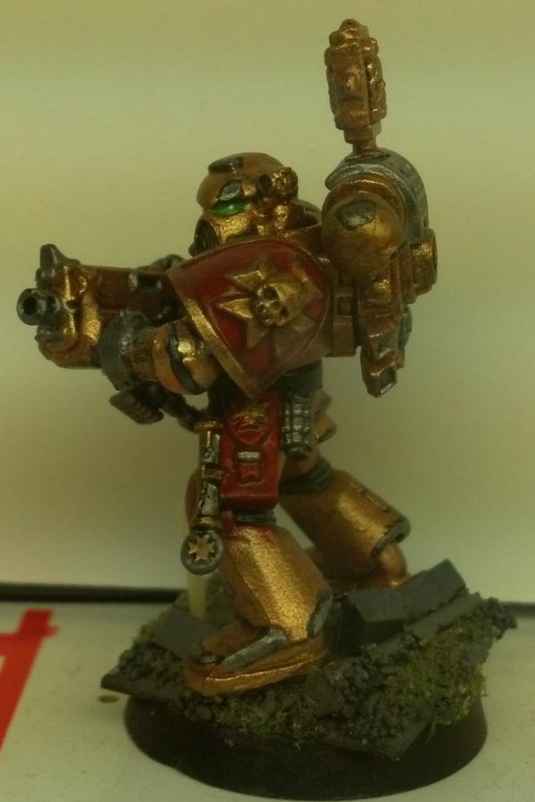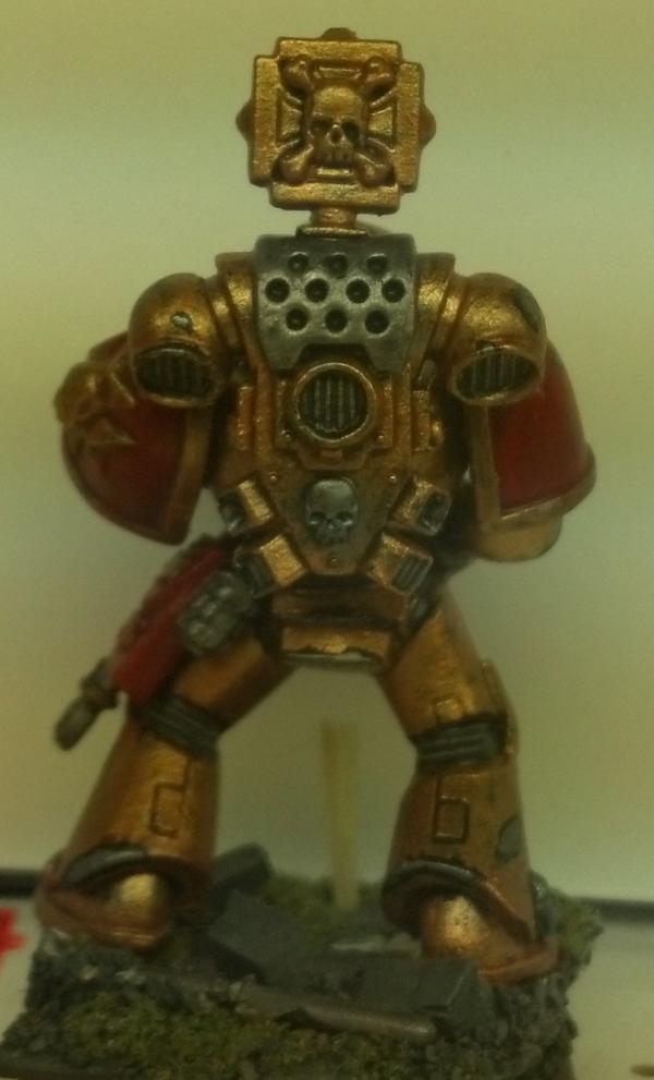 TLDR? Do you like the grey ones, the bronze ones, or do you think I should try something else out? Alrighty, I've been working on some other projects, so my marines have kind of fallen by the way-side. But I want to keep on working on them, when I get the inspiration. To that effect, I tried out a new color scheme and thought I'd share it with Dakka. I don't mind the idea of running a multi-chapter strike force, but I don't want my army to look too rag-tag. As it stands I have some tacticals, scouts, a rhino, and a few other odds and ends painted up as shadow knights (there's a link in my signature). The next image will give you the gist:  They look good in the right light, I particularly like the battle damage as it is a new thing for me, but in a poorly lit room they kind of wash out (highlighting and detail in general) And so you have the shadow knights. The next images are of a test model for what i'm tentatively calling the Brazen Templars. They're bronze with red, and silver chips and scratches rimmed in black. Compared to the subtler SK's, the BzT guy really pops from the table. The base (same as SKs) is a better contrast. Both schemes are pretty similar in amount of time involved, and I love both for different reasons, so I thought I'd ask you guys what you think. If I could come up with something else, I wouldn't mind painting that for the bulk of my forces either, but these are the best schemes I've sorted out to date. Do you guys think one of them is clearly better? Are they both so 'meh' that you think I should continue trying things out? Every test model I work through is one or more finished models (and possibly several if I go back and repaint what I've already done for the new scheme) that I could have painted instead, so I'm hesitant. Thoughts? Comments and criticisms greatly appreciated (the Brazen Templar guy is done, but I did him quick for the purposes of testing, and stole his base from another marine (note the white spot that was under the first guy's boot!). Thanks for looking P.S. there are a lot more pictures of the shadow knights in gallery, and a couple more of the templars, if you wanted to see what the schemes look like on vehicles ( SK only) and terminators ( SK, and WIP BzT).