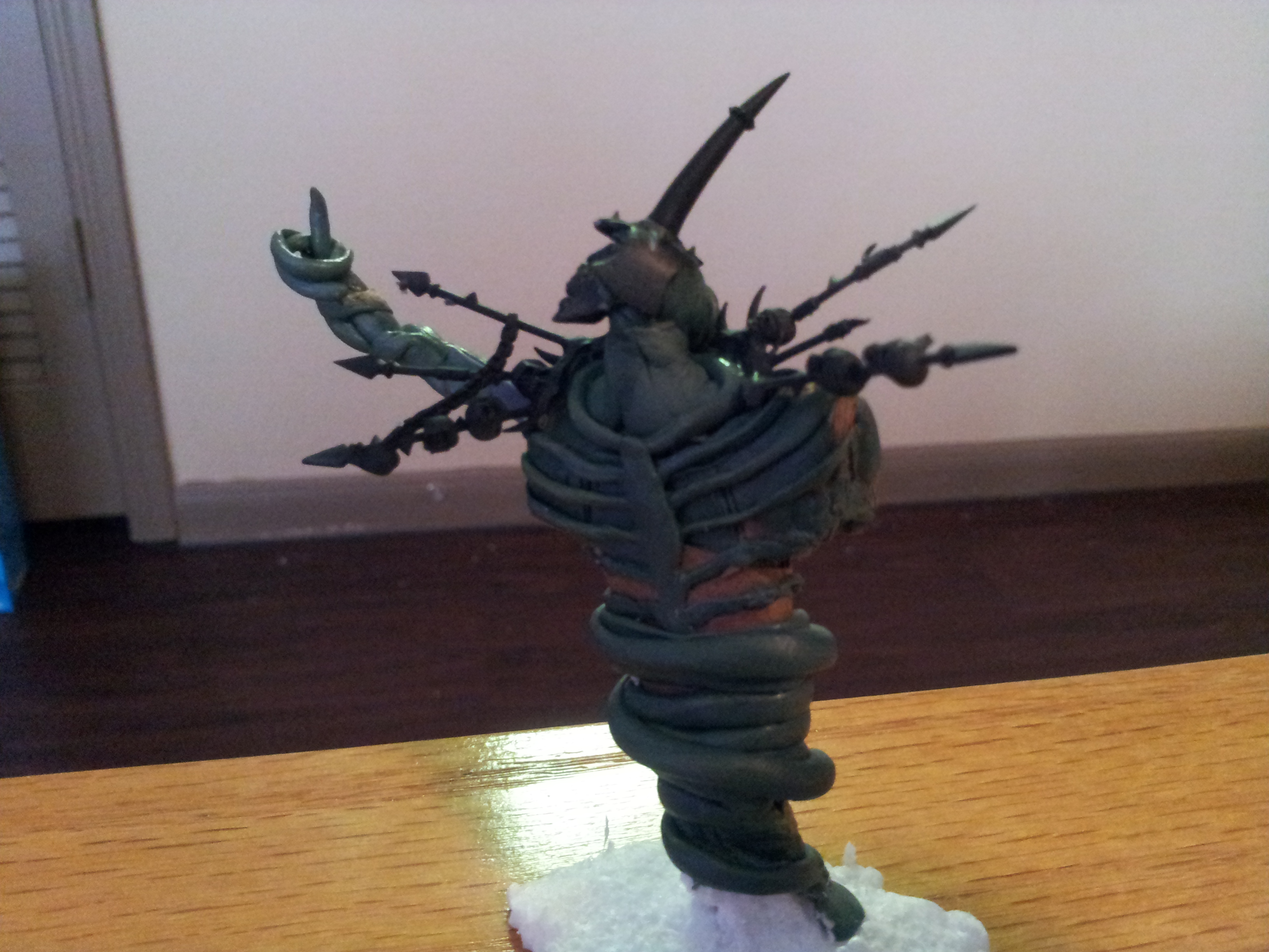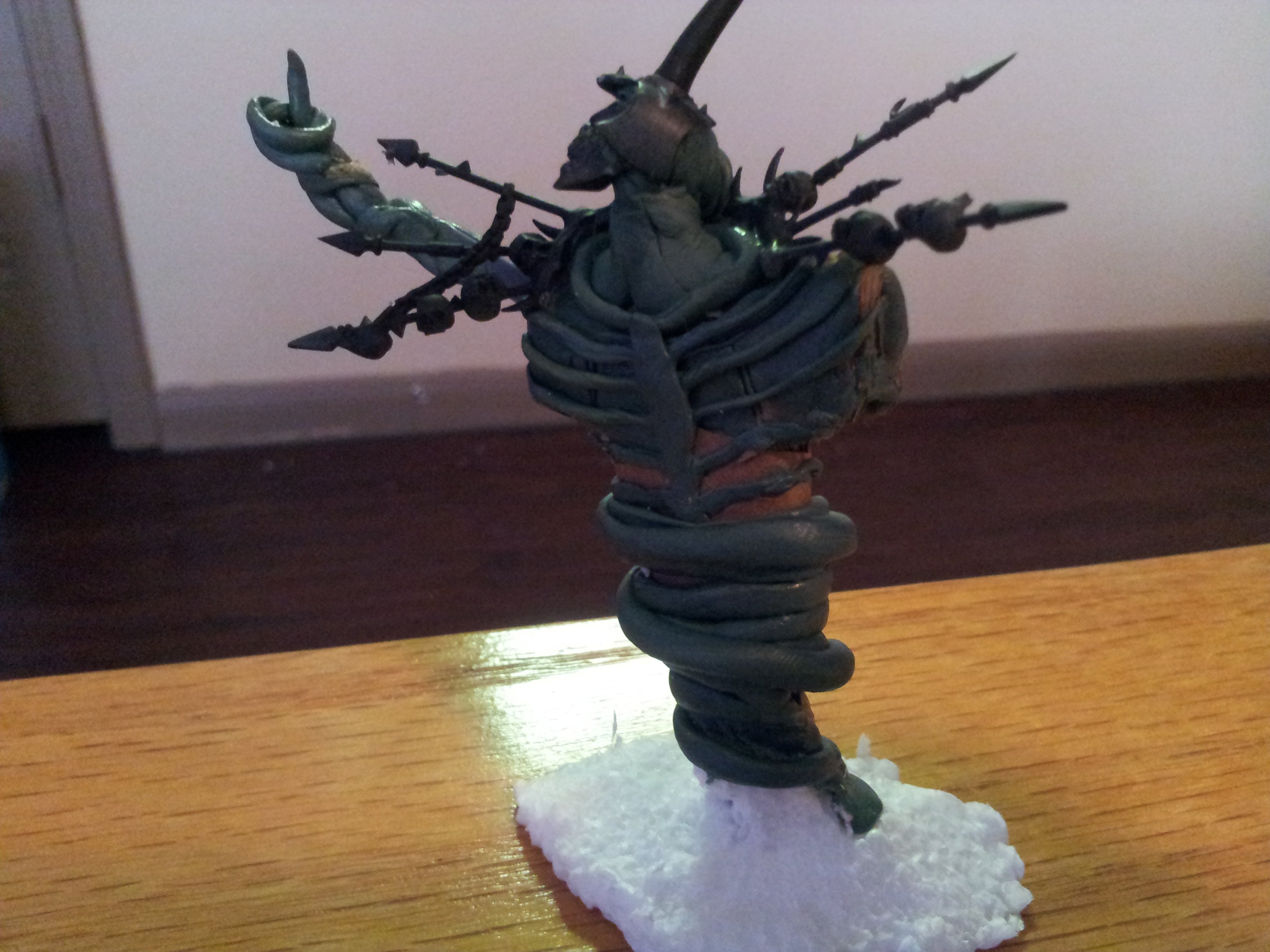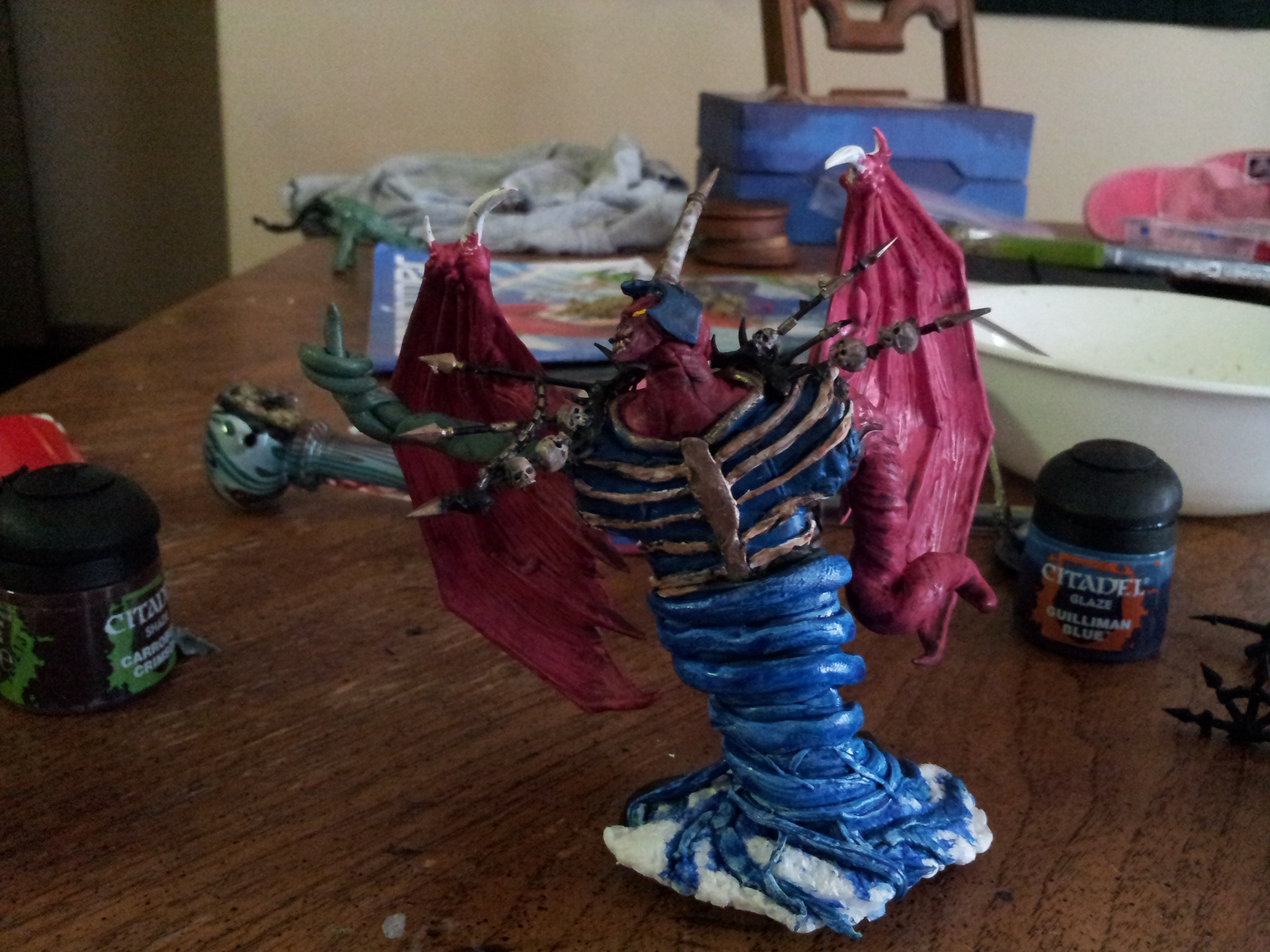 working on making a original demon prince of tzeentch model. Got part done but wanting opinions on what i have so far and the direction i will be going. At the moment going with a single horned helm and rib cage style armour with elaborat trophy slash cape collar with a cape thst has two long sashes going down each shoulder. right arm a multi tentical mass in the shape of an arm ending in 3 tentical hand graspind a staff. the left arm one large smashing tentical, all flesh would be daemon flesh pink. Bright blues and golds armour coloring with bblack and bloody bone highlights. Then with a skull embroidered belt instead of legs a swirling blue spirel of magic bursting from the ground like he had just came in to being from a explosion and tornado of magic like some sort of daemon cork screw. Oh and almost forgot lord of change wings.