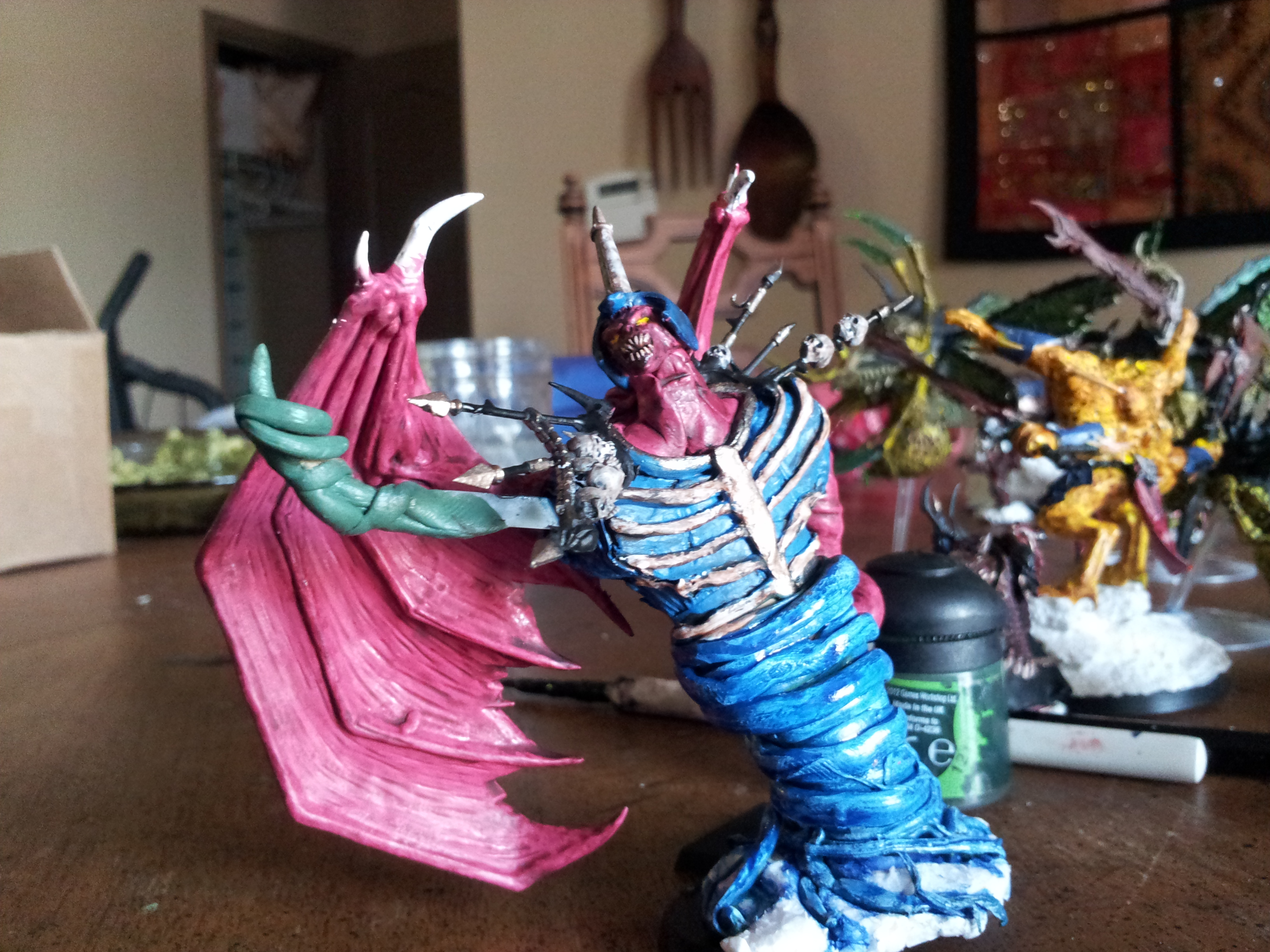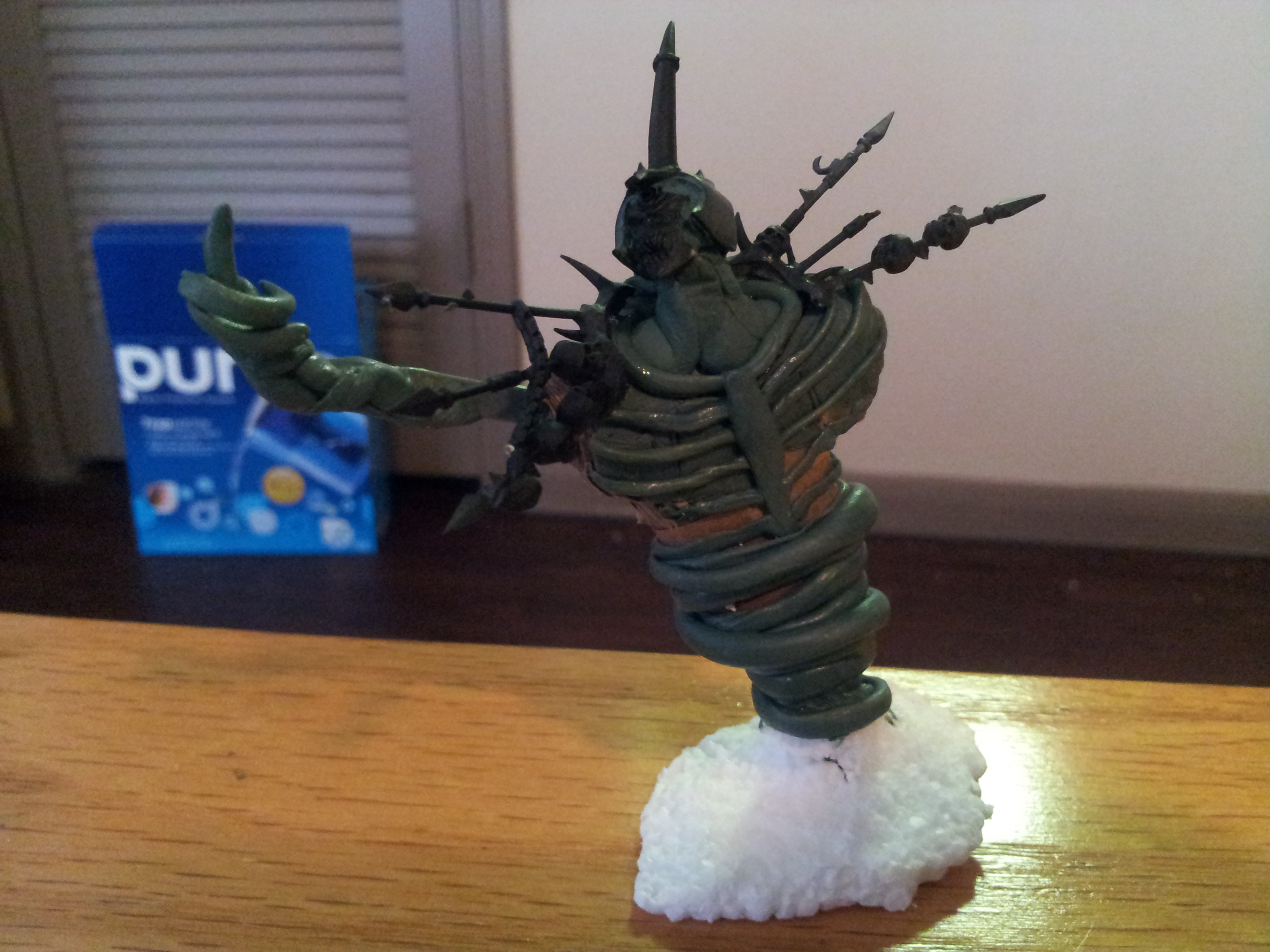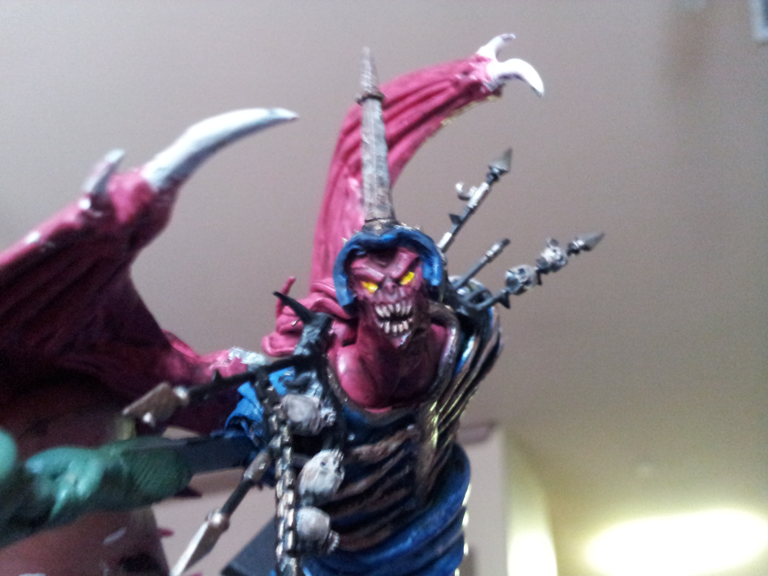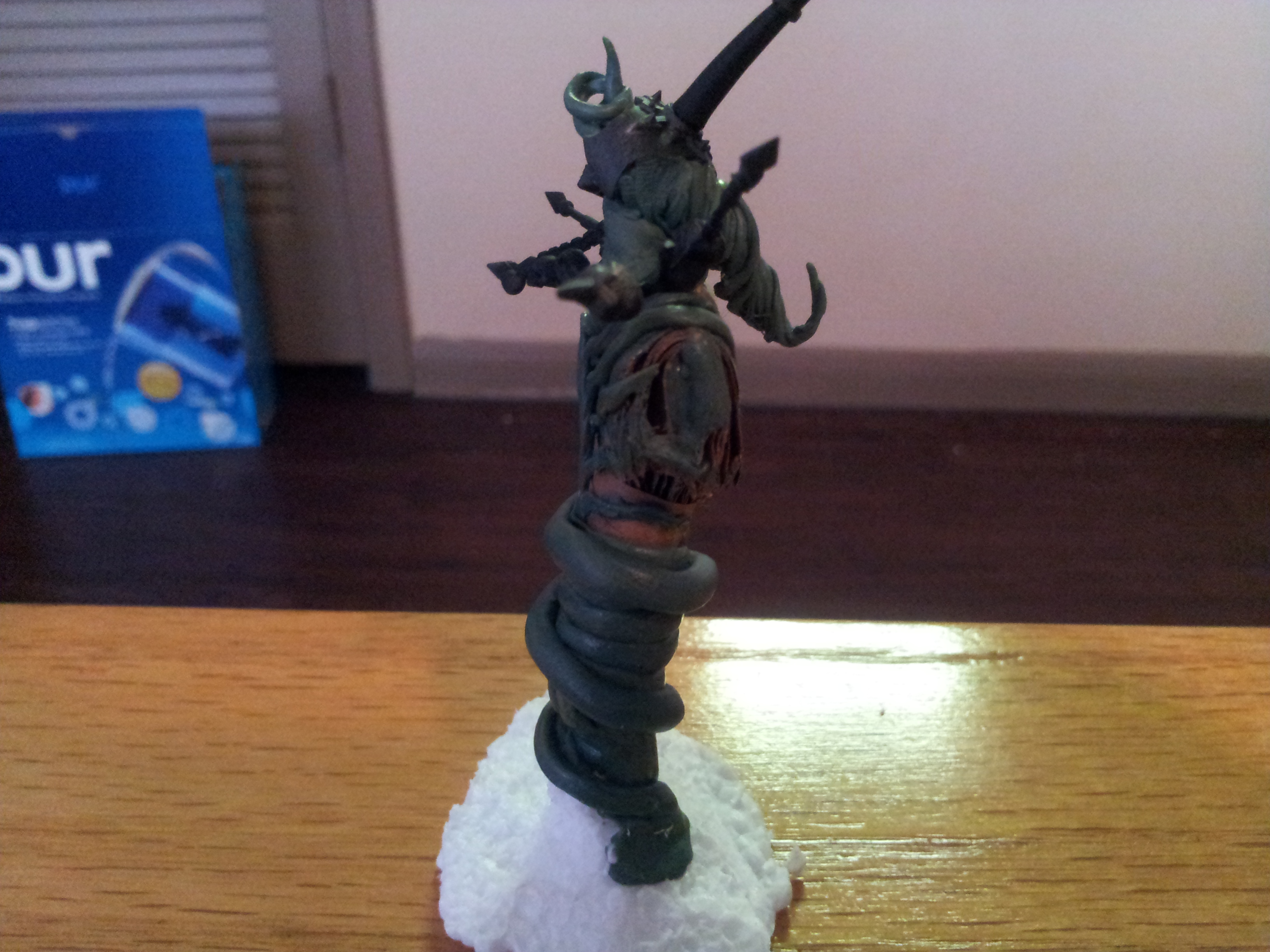 working on making a original demon prince of tzeentch model. Got part done but wanting opinions on what i have so far and the direction i will be going. At the moment going with a single horned helm and rib cage style armour with elaborat trophy slash cape collar with a cape thst has two long sashes going down each shoulder. right arm a multi tentical mass in the shape of an arm ending in 3 tentical hand graspind a staff. the left arm one large smashing tentical, all flesh would be daemon flesh pink. Bright blues and golds armour coloring with bblack and bloody bone highlights. Then with a skull embroidered belt instead of legs a swirling blue spirel of magic bursting from the ground like he had just came in to being from a explosion and tornado of magic like some sort of daemon cork screw. Oh and almost forgot lord of change wings.