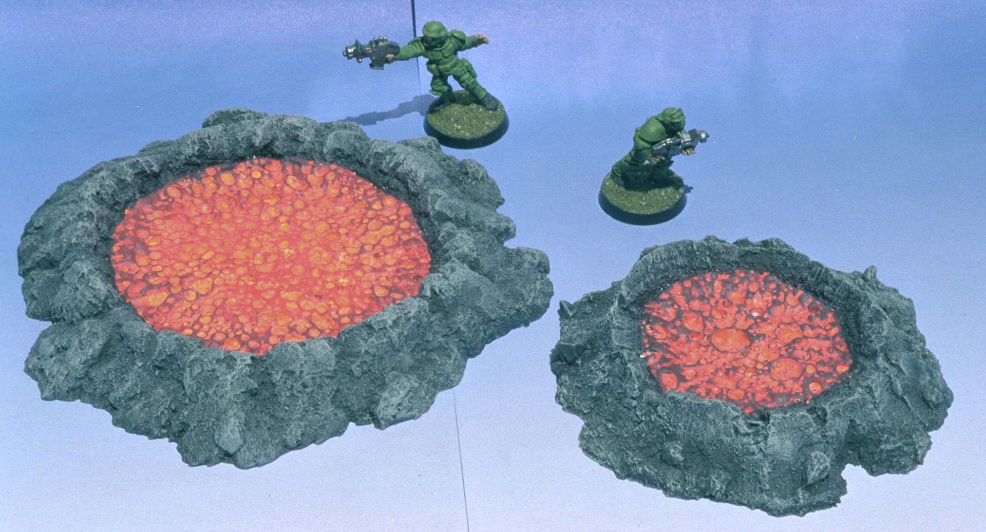 The lava in these craters was primed white followed by a coat of fluorescent yellow. They were then reverse drybrushed (light to dark) with fluorescent orange, fluorescent red, dark red and a dark charcoal gray to represent the cooling lava. They are MUCH brighter in person.They are bright enough in person for Steve Jackson to think that there was a light source under the craters. Were I to paint another set, I would add a bit of fluorescent red or orange