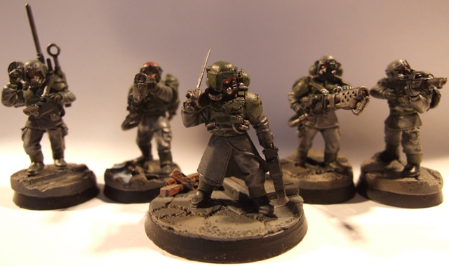 this is my Kasrkin command squad with the final conversion work done and finally mounted on 32mm secret weapons miniatures urban streets bases to match the rest of the force.