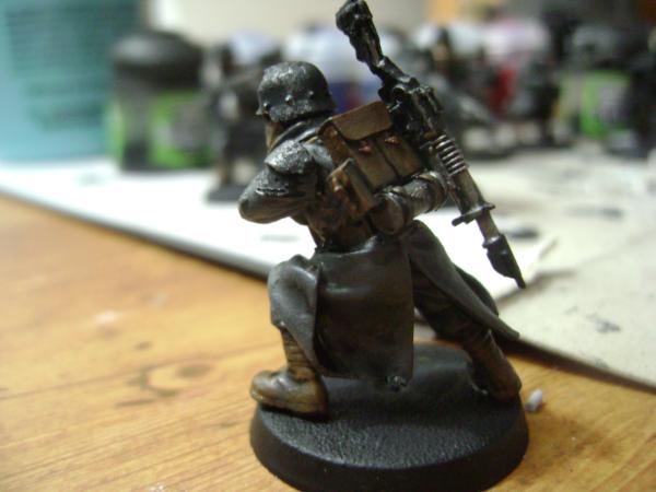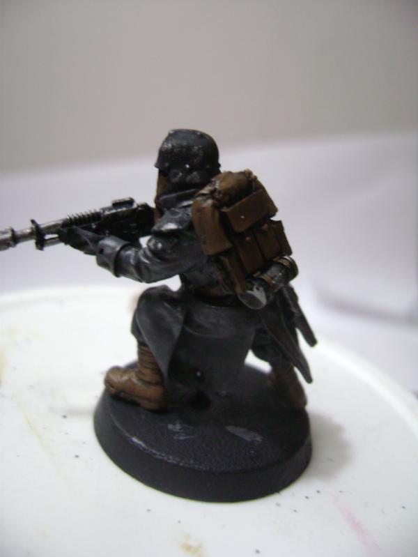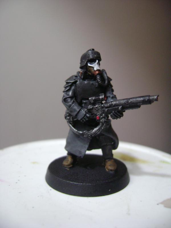 This is my test model; the scheme I've used before on some Steel Legion I have for my main Guard army (Cadians are bloody ugly, truth be told, the heads are horrid). I haven't done the base yet, but I'm going to go for some mud. Mud looks good on Korps. Mud looks good on Guard, period.