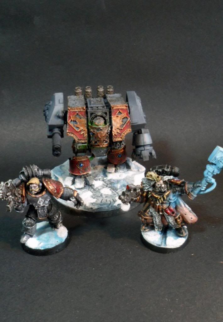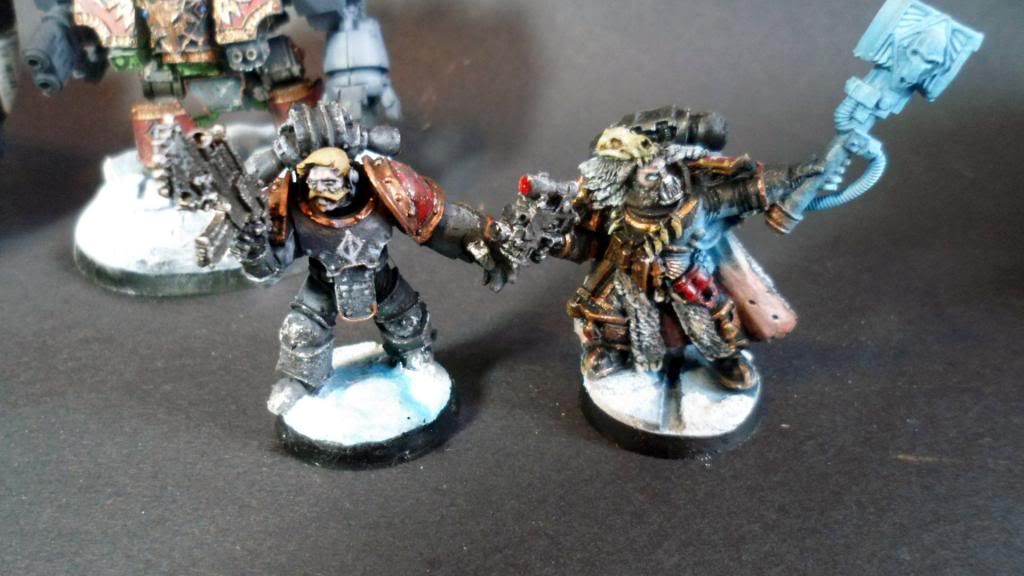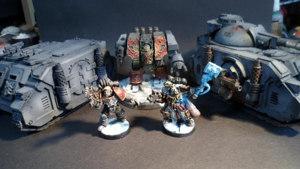 Now for the update. I've built more troops and such, but i want to inject more personality into the force yet. For now a wolf priest i've had for years and a few tanks in various states of progress. I've made efforts to get the slight melt/fresh ice-snow mixture to show up but it's whiting out most of the time.