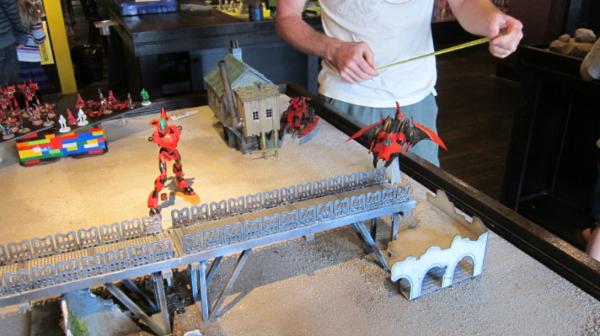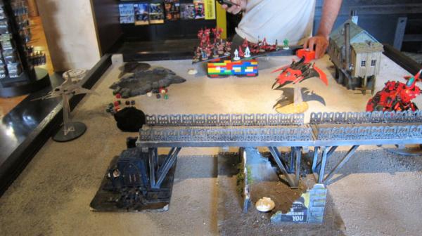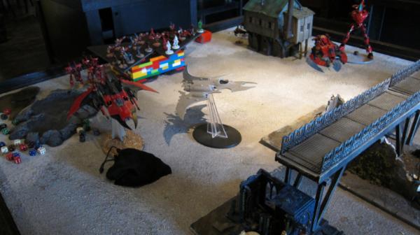 The Eldar now have to go for objectives. The big unit of jetbikes comes out from behind the landing pad and prepares to take down the thirster. The other bike unit gets ready to grab the center objective with turbo boosting. The wraith knight jumps on top of the bridge.