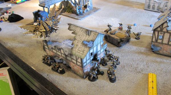 The shooting this turn wrecks another rhino while the biker squad gets reduced to the lord, aspiring champion and a melta gun. The survivors of the newest rhino wreck pile towards the building behind which my sorcerer is hiding. There’s an objective there on the other side.