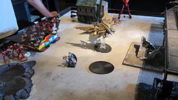 All the Eldar reserves show up except for the crimson hunter exarch. The wraithknight decides to mix it up and advances on me. The wave serpent drives out from behind a building.