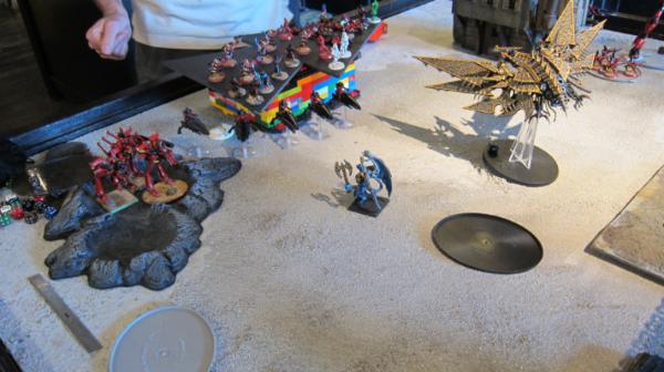 The crimson hunter exarch comes in and screams up the left side of the board. The wraith knight moves over to the right some more.