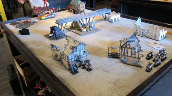 In my turn I get the obliterators and one heldrake in. After spending a lot of time thinking, I decide to send my obliterators toward the middle (they’re obscured by the drake in the picture). The heldrake goes in front of the building with the sorcerer. The bloodthirster is turned invisible and flies into the ruins in the middle. The lord abandons the bikers and joins a unit of marines for his fearlessness.