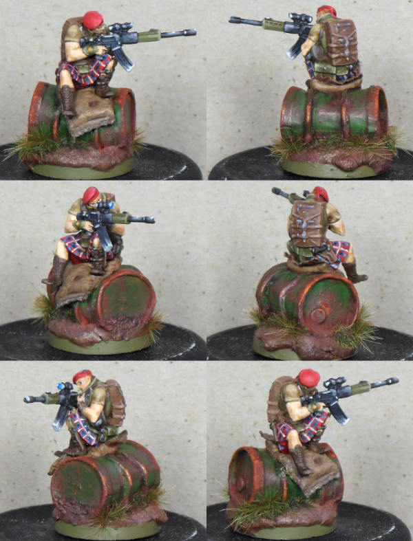 There's a 3mm magnet in his bottom and another one in the sand bag on the custom 25mm base. This way I keep the option to as well use him on his original 40mm scenic (correct English word?) in the future, if I like to.