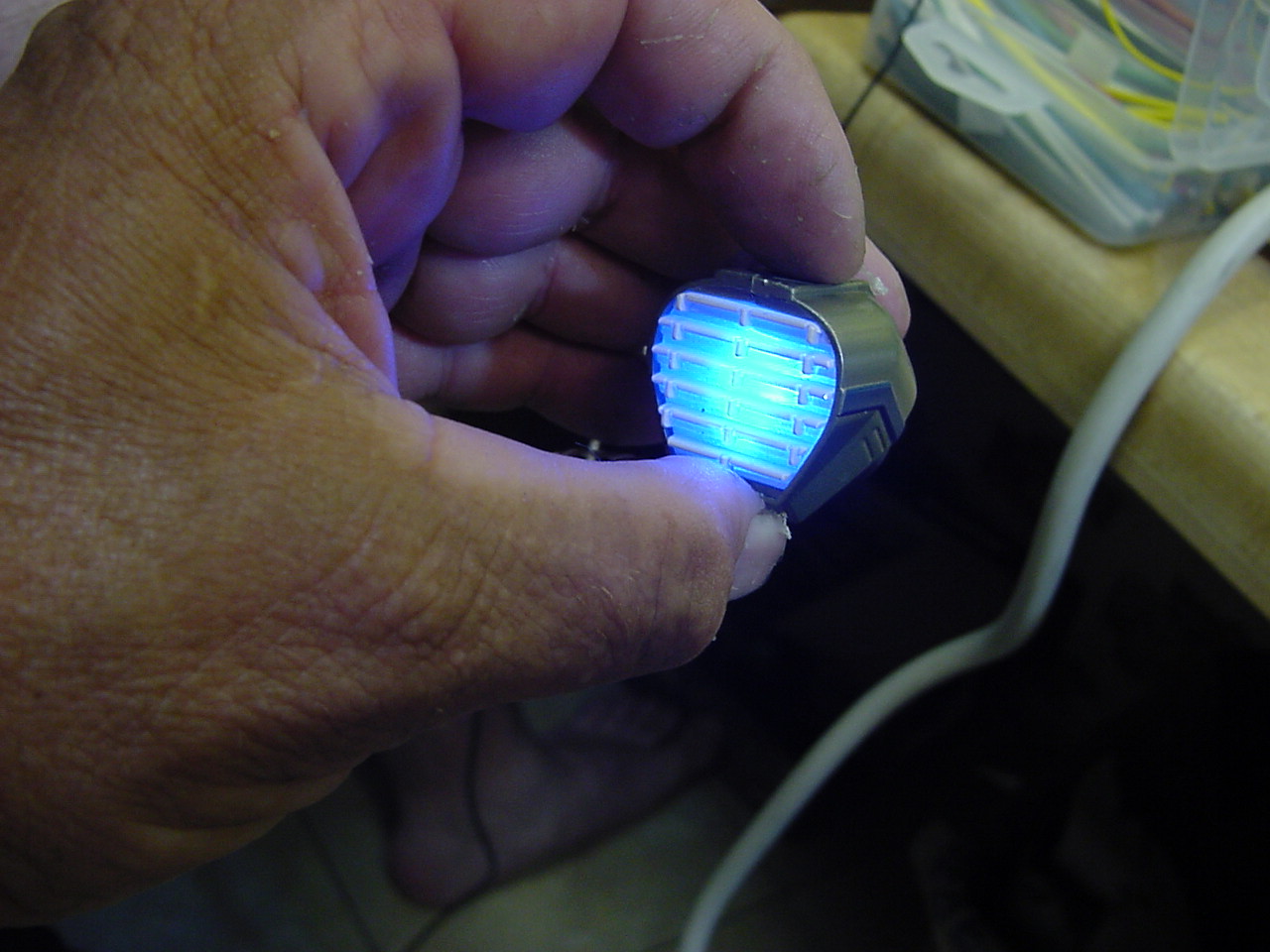 Next you carve out the old toy LED (and save it) and replace it with your fancy new one